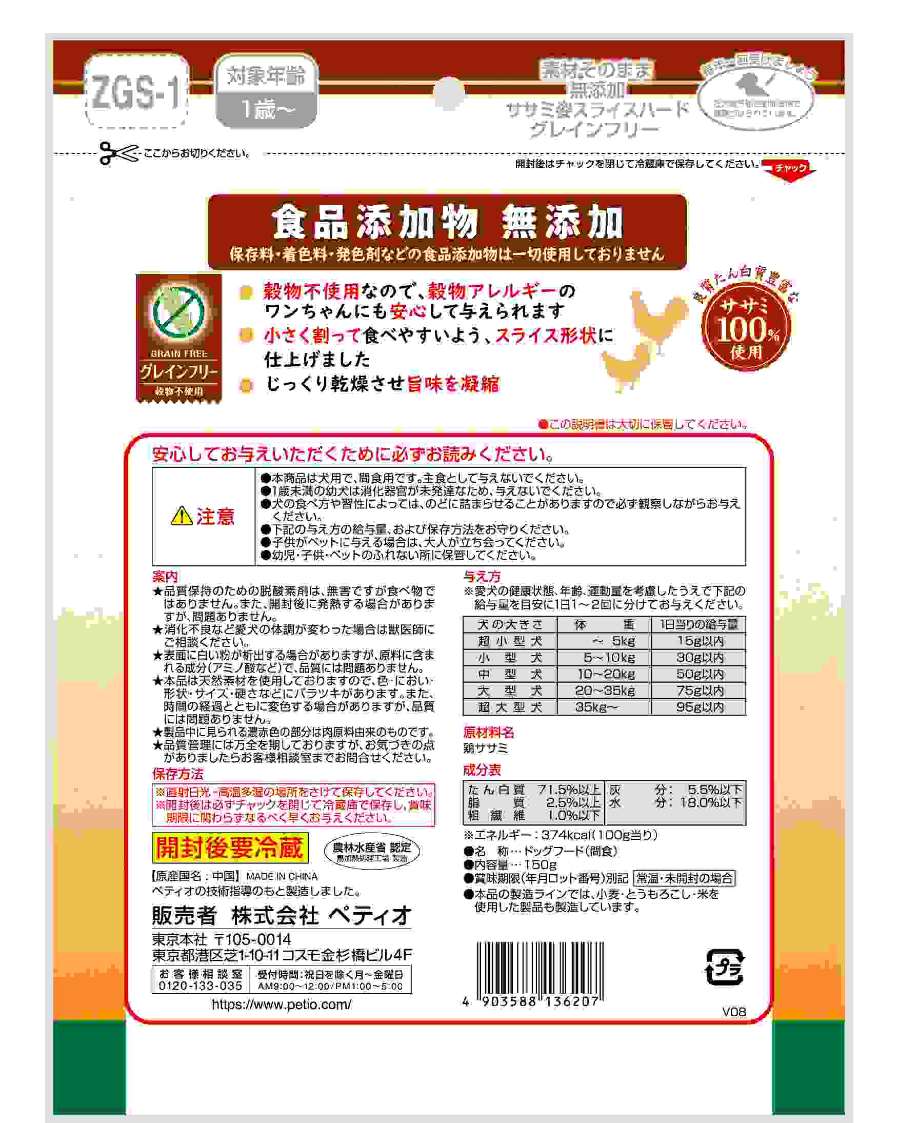 ペティオ 素材そのまま 無添加 ササミ姿スライスハード グレインフリー 150g