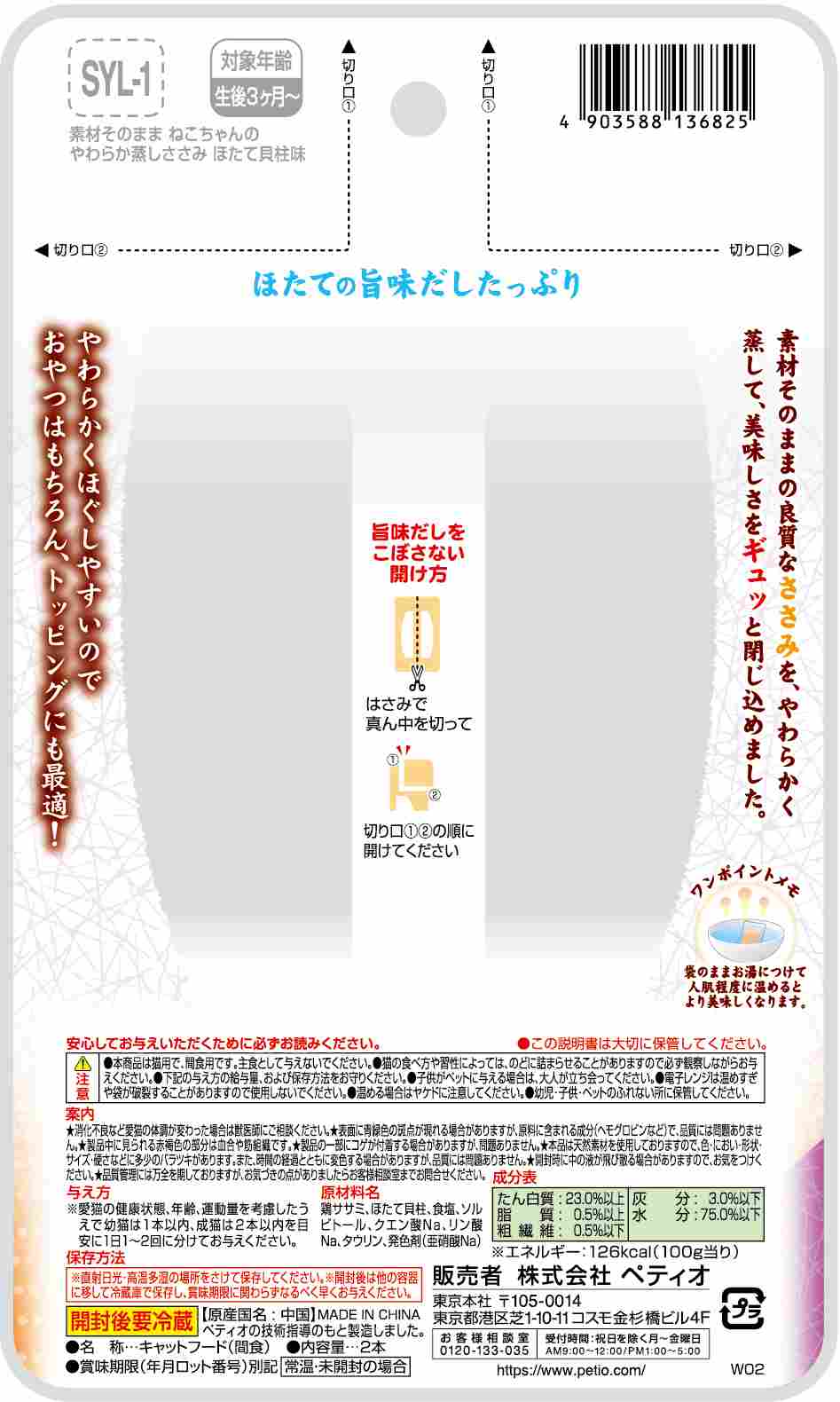 ほたての旨味だしたっぷり。素材そのままの良質なささみを、やわらかく蒸して、美味しさをギュッと閉じ込めました。やわらかくほぐしやすいので、おやつはもちろん、トッピングにも最適!猫ちゃんの健康維持にタウリン配合。2つに分けて保存できる。着色料 不使用。