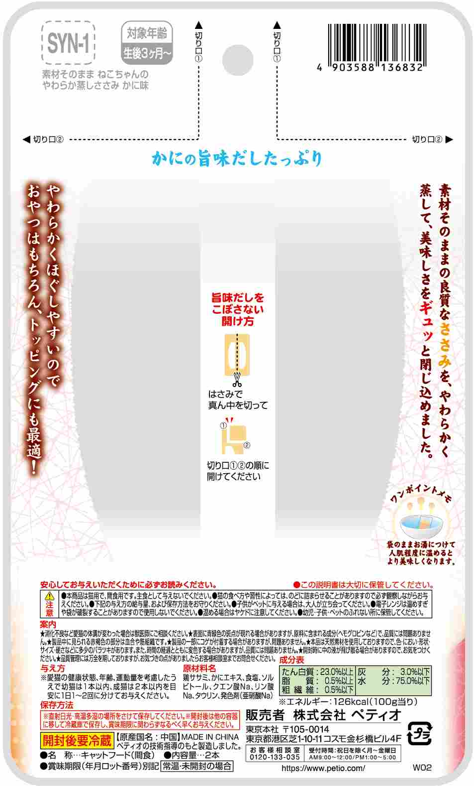 かにの旨味だしたっぷり。素材そのままの良質なささみを、やわらかく蒸して、美味しさをギュッと閉じ込めました。やわらかくほぐしやすいので、おやつはもちろん、トッピングにも最適!猫ちゃんの健康維持にタウリン配合。2つに分けて保存できる。着色料 不使用。