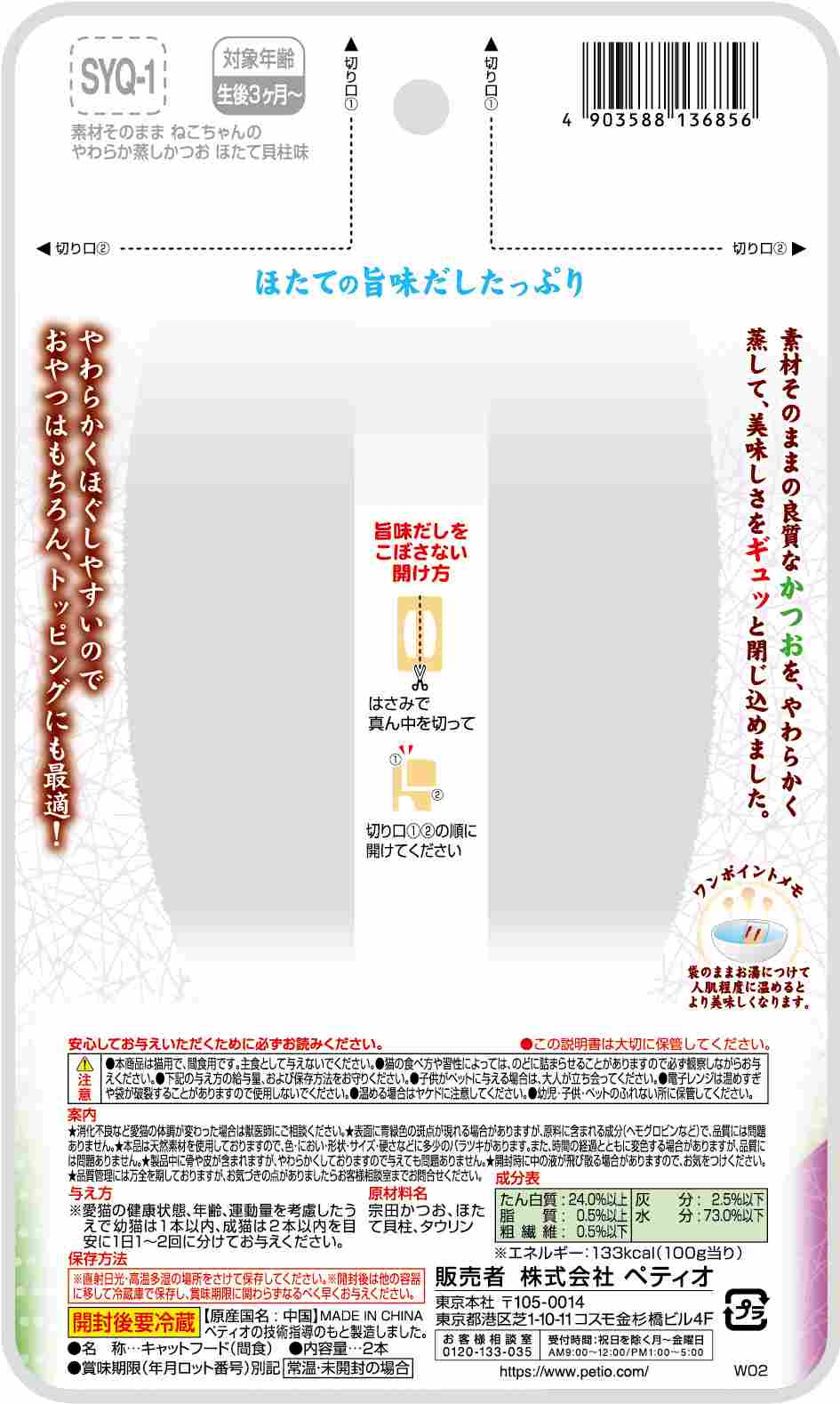 ほたての旨味だしたっぷり。素材そのままの良質なかつおを、やわらかく蒸して、美味しさをギュッと閉じ込めました。やわらかくほぐしやすいので、おやつはもちろん、トッピングにも最適!猫ちゃんの健康維持にタウリン配合。2つに分けて保存できる。着色料 不使用。