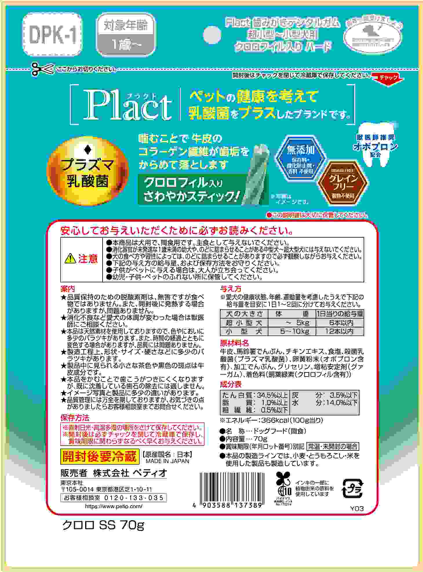 Plactはペットの健康を考えて乳酸菌をプラスしたブランドです。噛むことで牛皮のコラーゲン繊維が汚れをからめて落とします。超小型犬~小型犬にピッタリサイズ!グレインフリーだからワンちゃんの健康サポート・ 食物アレルギーケアができる。獣医師推奨オボプロン配合。酸化防止剤・保存料・香料無添加。