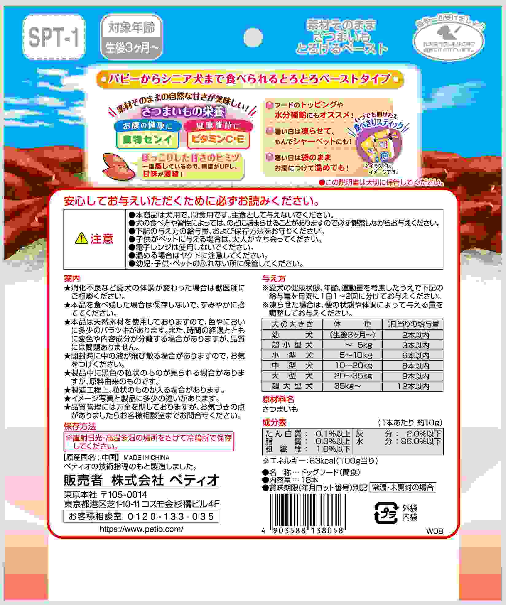食物センイやビタミンC・Eなど栄養たっぷりのさつまいもをペーストタイプにしました。パピーからシニア犬まで食べやすいとろける食感。素材そのままの自然な甘さが美味しい!暑い日は凍らせて、もんでシャーベットにも!寒い日は袋のままお湯につけて温めても!香料・着色料無添加。