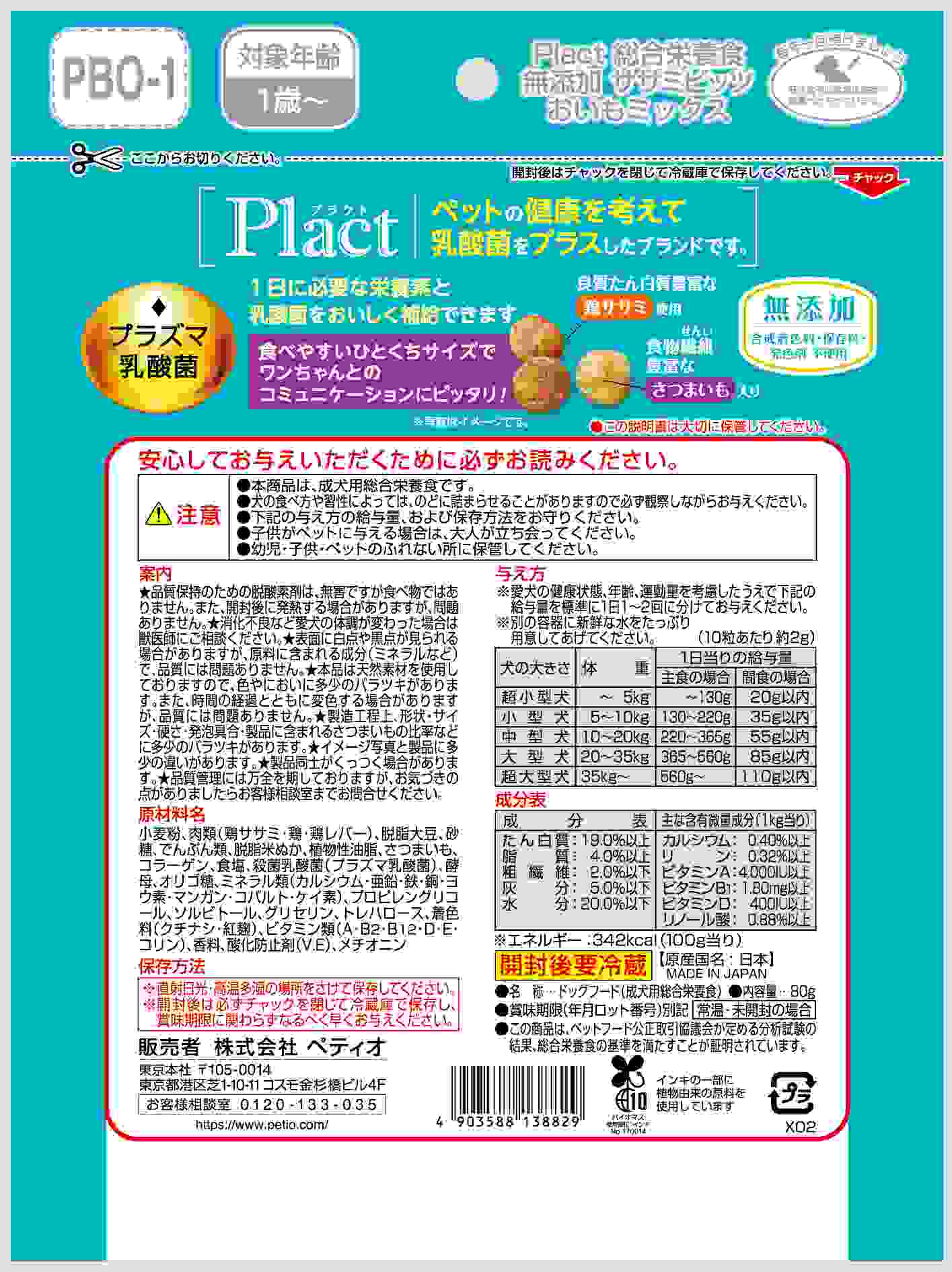 Plactはペットの健康を考えて乳酸菌をプラスしたブランドです。食べやすいひとくちサイズでワンちゃんとのコミュニケーションにもピッタリ!良質たん白質豊富な鶏ササミと食物繊維豊富なさつまいものミックスタイプ。合成着色料・保存料・発色剤無添加。