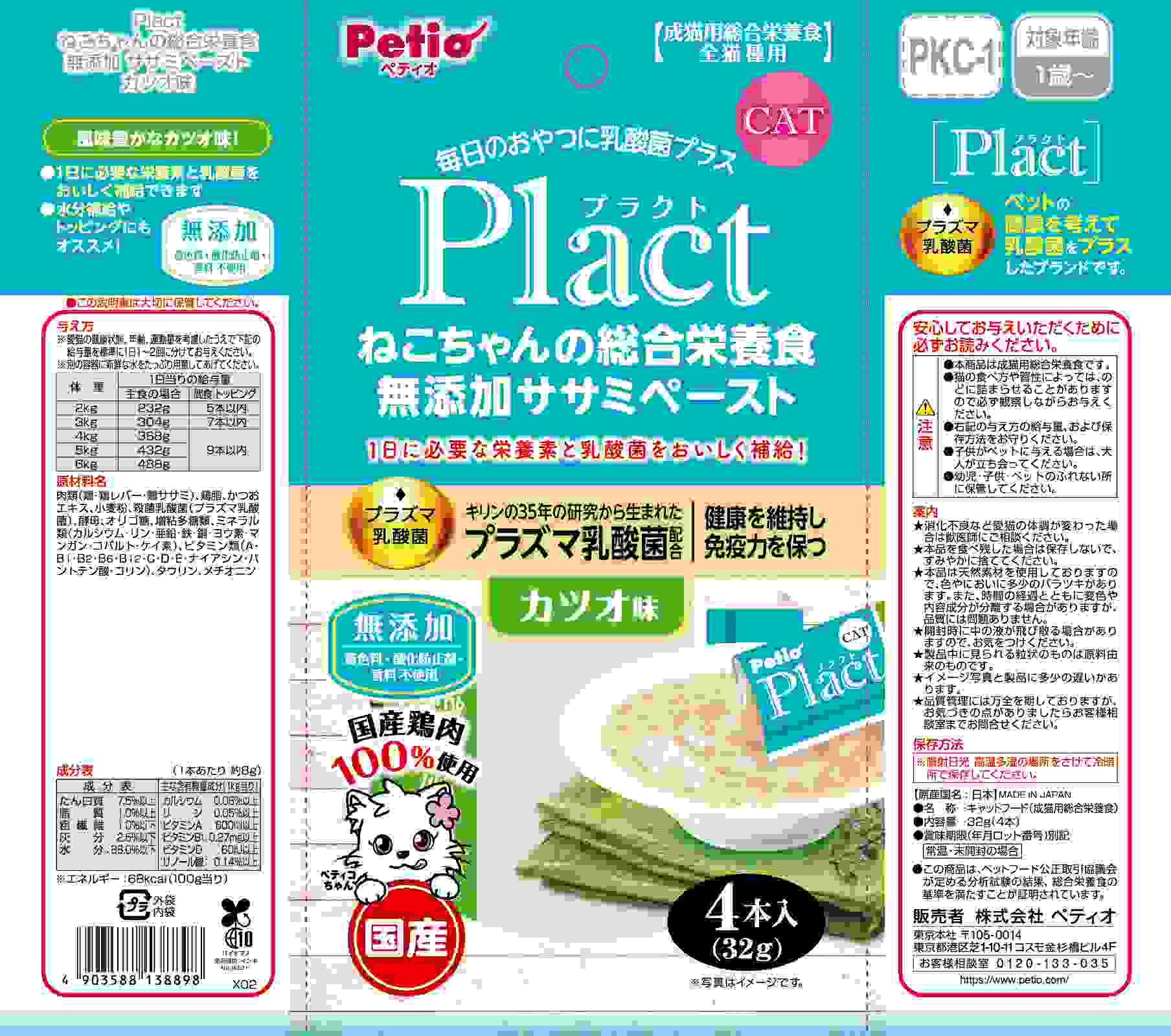 Plactはペットの健康を考えて乳酸菌をプラスしたブランドです。そのままでも、フードのトッピングとしても与えやすいなめらかペーストタイプ。国産鶏肉を100%使用!風味豊かなカツオ味。着色料・酸化防止剤・香料無添加。