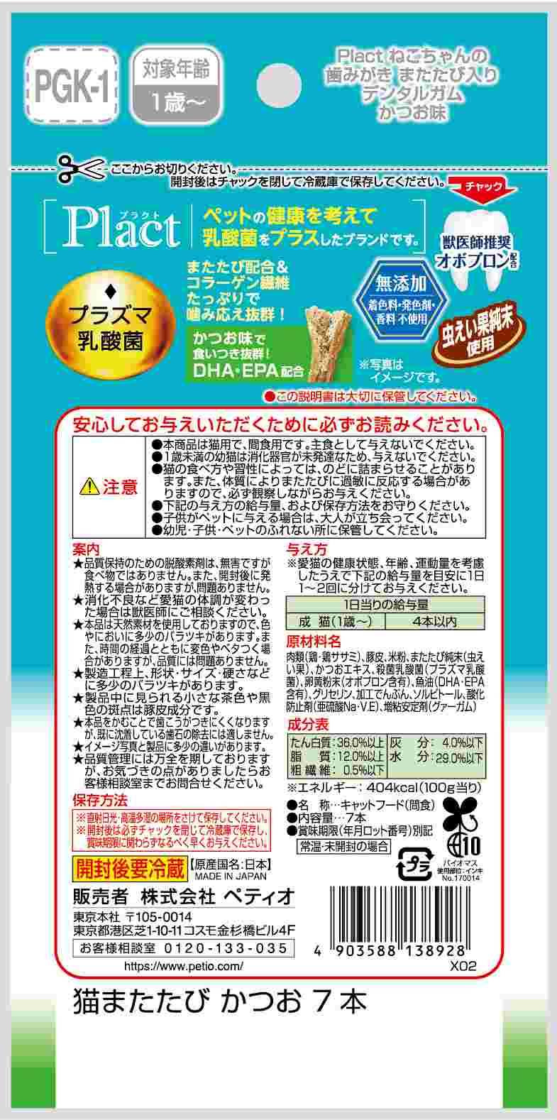 Plactはペットの健康を考えて乳酸菌をプラスしたブランドです。またたび入りのデンタルガムを噛むことで豚皮のコラーゲン繊維が歯垢をからめて落とします。かつお味で食いつき抜群!着色料・発色剤・香料無添加。
