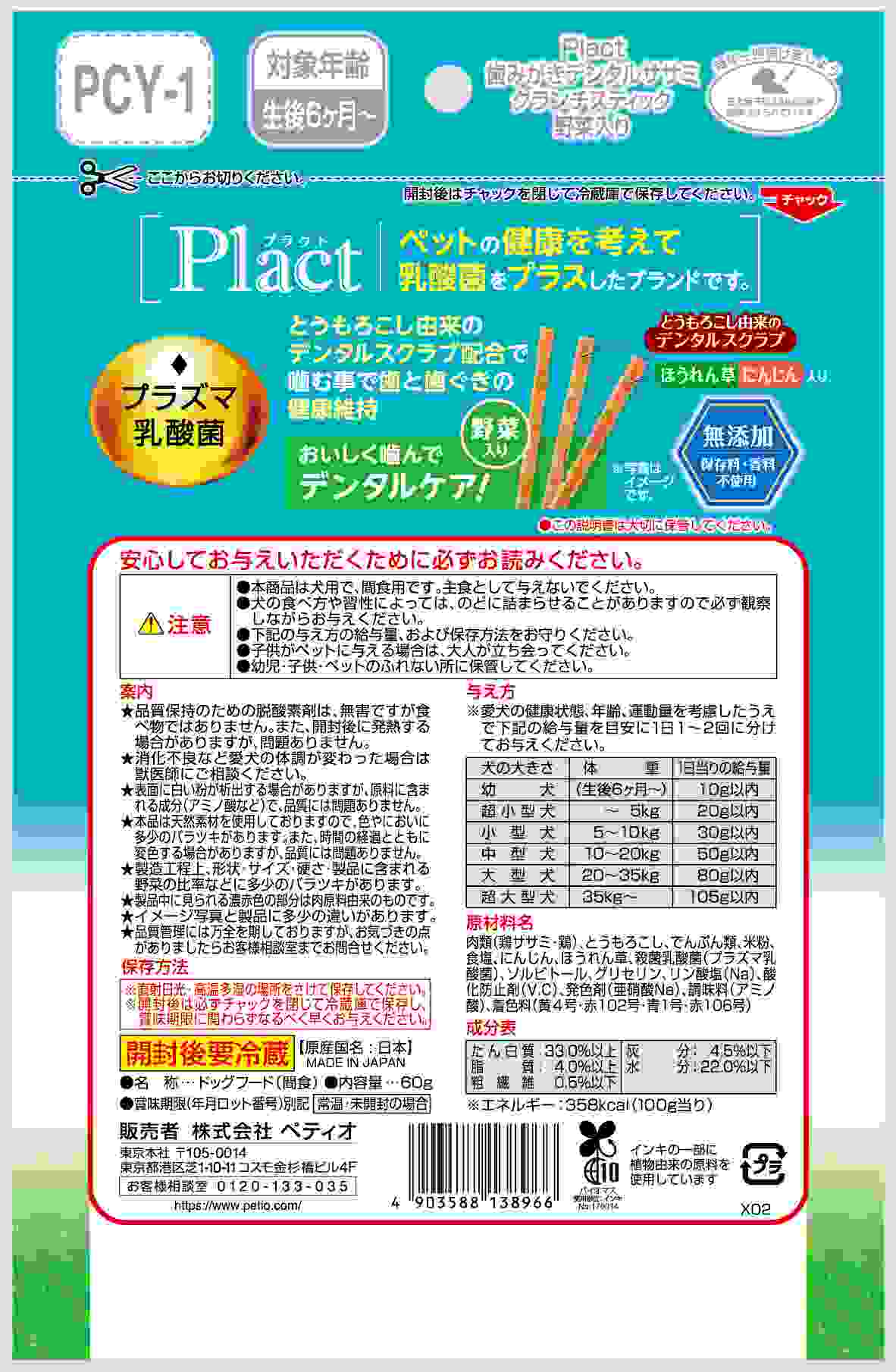 Plactはペットの健康を考えて乳酸菌をプラスしたブランドです。おいしく食べやすいササミの細切りにとうもろこし由来のデンタルスクラブを配合。毎日美味しく歯みがきできる!保存料・香料無添加。栄養豊富な野菜入り。