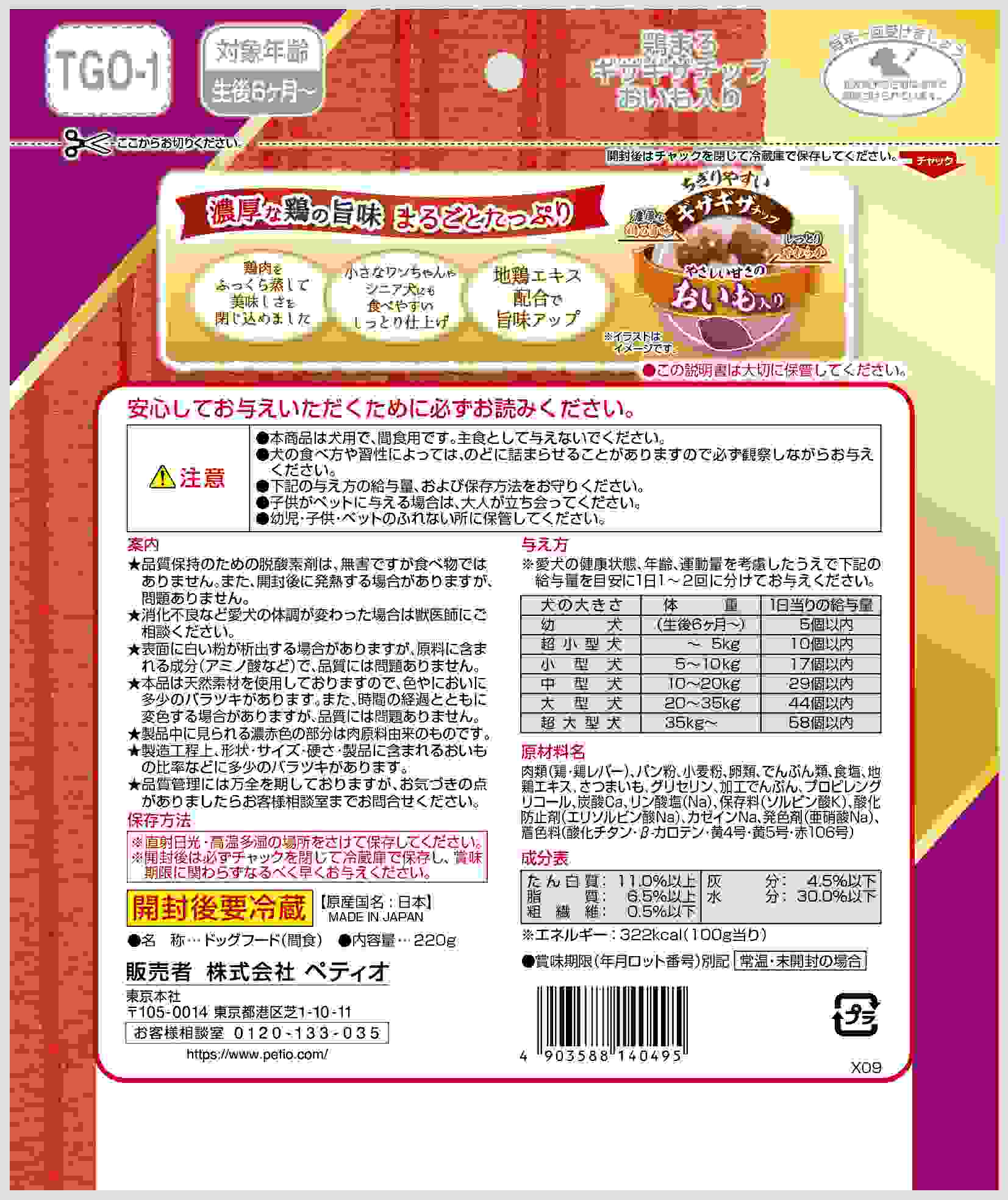 濃厚な鶏の旨味まるごとたっぷり。鶏肉をふっくら蒸して美味しさを閉じ込めました。小さなワンちゃんやシニア犬にも食べやすいしっとり仕上げ。ちぎりやすいギザギザチップ形状。やさしい甘さのおいも入り。地鶏エキス配合で旨味アップ。