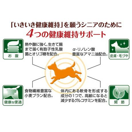 「いきいき健康維持」を願うシニアのために4つ(お腹、皮膚・毛づや、健康な便通、関節)の健康維持サポート。