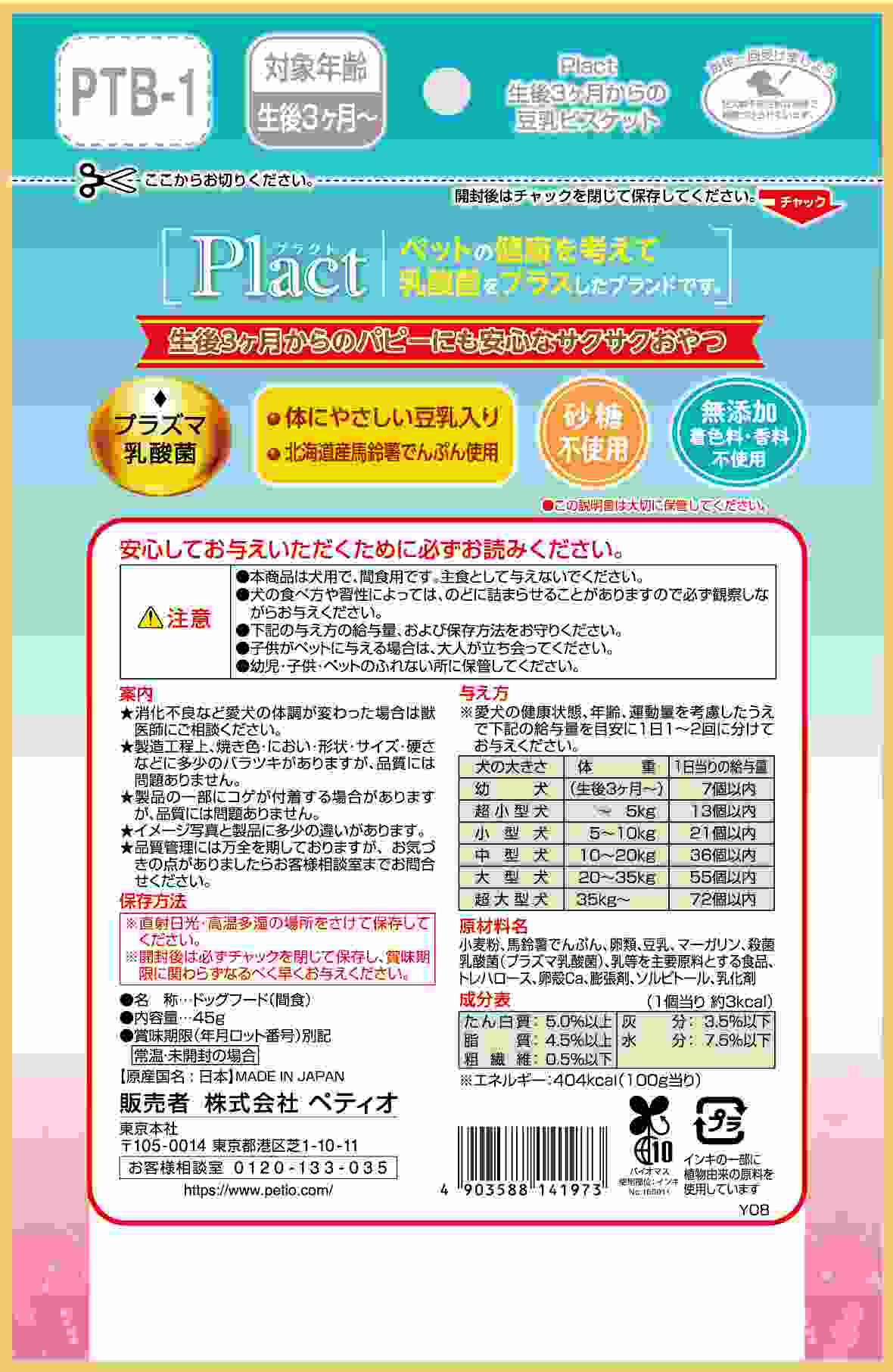 Plactはペットの健康を考えて乳酸菌をプラスしたブランドです。生後3ヶ月のパピーも食べやすい豆乳ビスケット。パピーの健康に配慮し、体にやさしい豆乳入り。着色料・香料無添加。