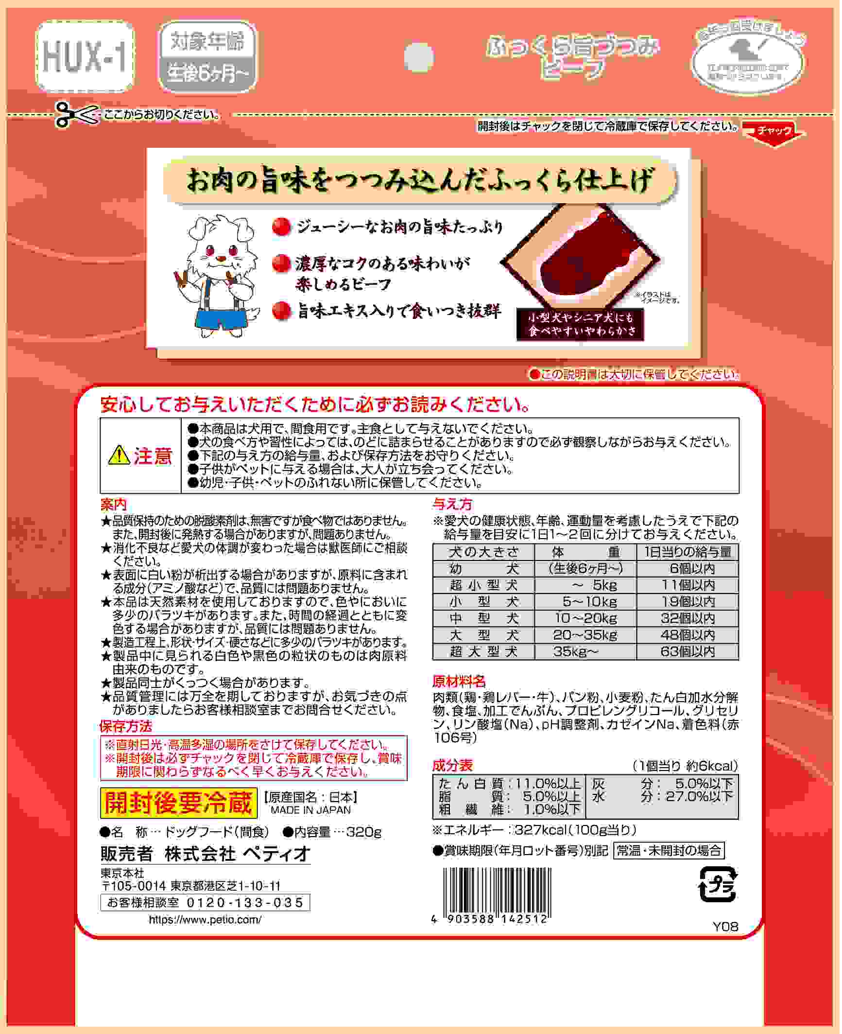お肉の旨味をつつみ込んだふっくら仕上げ。ジューシーなお肉の旨味たっぷり。濃厚なコクのある味わいが楽しめるビーフ。大満足の食べごたえ。小型犬やシニア犬にも食べやすいやわらかさ。
