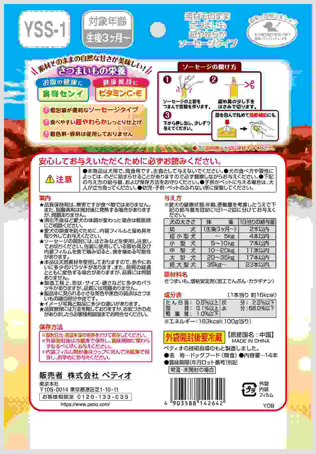 食物センイやビタミンC・Eなど栄養たっぷりのさつまいもを、個包装が便利なソーセージタイプにしました。素材そのままの自然な甘さが美味しい!パピーからシニア犬まで食べやすい超やわらかしっとり仕上げ。着色料・香料無添加。