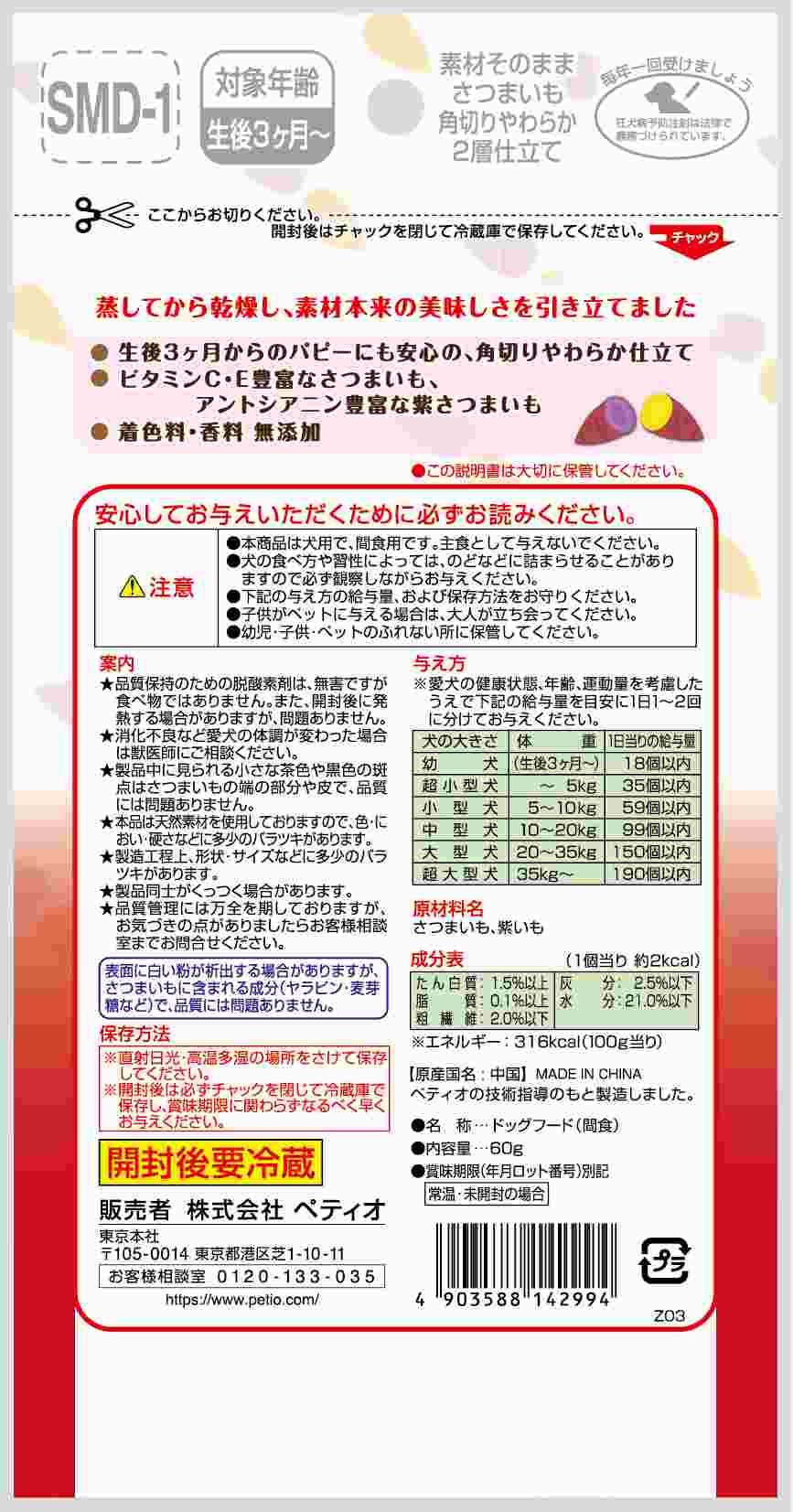 蒸してから乾燥し、素材本来の美味しさを引き立てました。ビタミンC・E豊富なさつまいも、アントシアニン豊富な紫さつまいもを100%使用。やわらか仕立てなので、生後3ヶ月からのパピーにも安心して与えられます。着色料・香料 無添加。