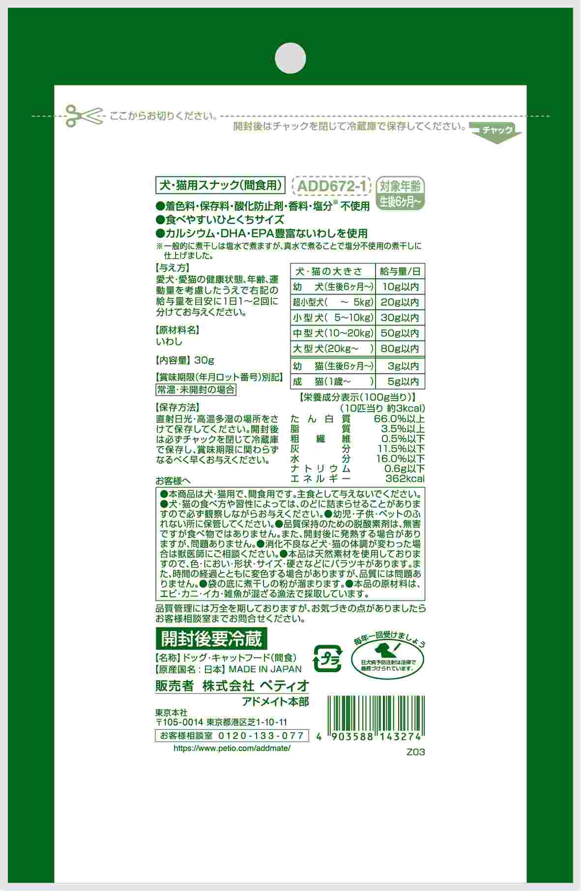アドメイト 素材トリーツ 塩分不使用 小さな煮干し 30g