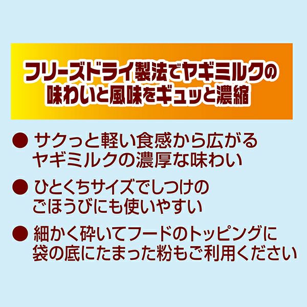フリーズドライ製法でヤギミルクとササミの味わいと風味をギュッと濃縮。 天然のカルシウムをおいしく手軽に! サクっと軽い食感から広がるヤギミルクの濃厚な味わい。 ひとくちサイズでごほうびにも使いやすい。 細かく砕いてフードのトッピングに。 着色料・保存料・香料 無添加。 農林水産省認定 鳥加熱処理工場製造。