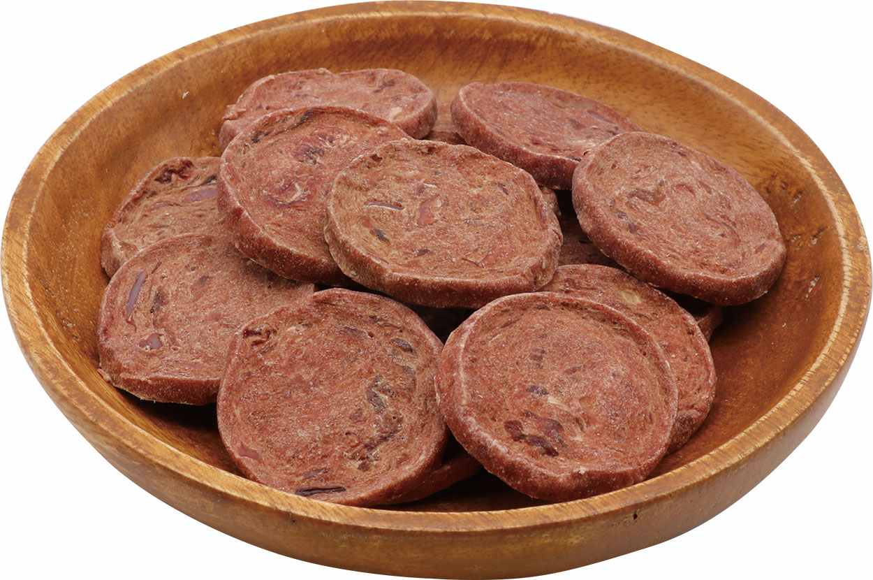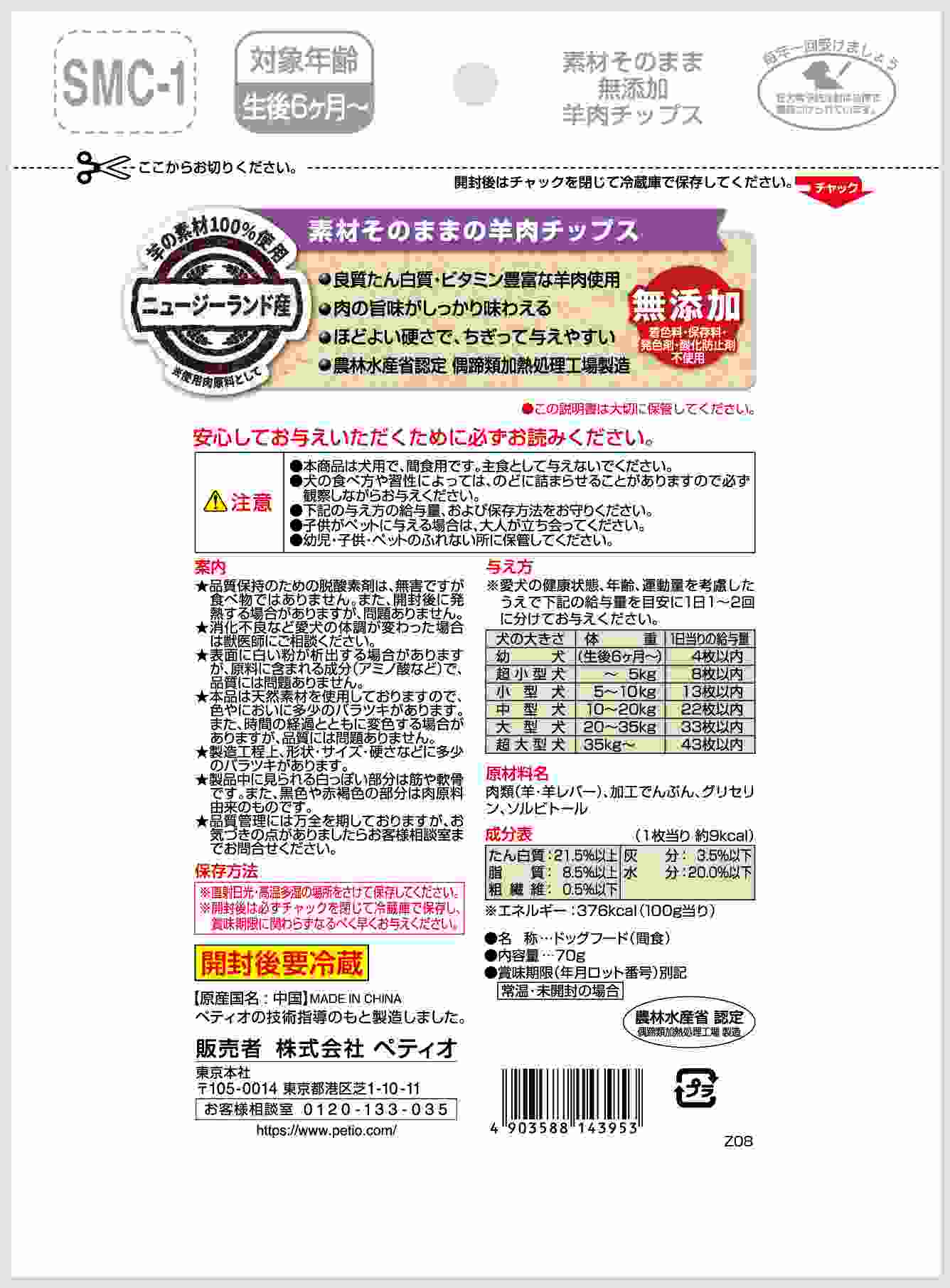 良質たん白質・ビタミン豊富な羊肉使用。肉の旨味がしっかり味わえる。ほどよい硬さで、ちぎって与えやすいチップス形状。着色料・保存料・発色剤・酸化防止剤無添加。農林水産省認定 偶蹄類加熱処理工場製造。