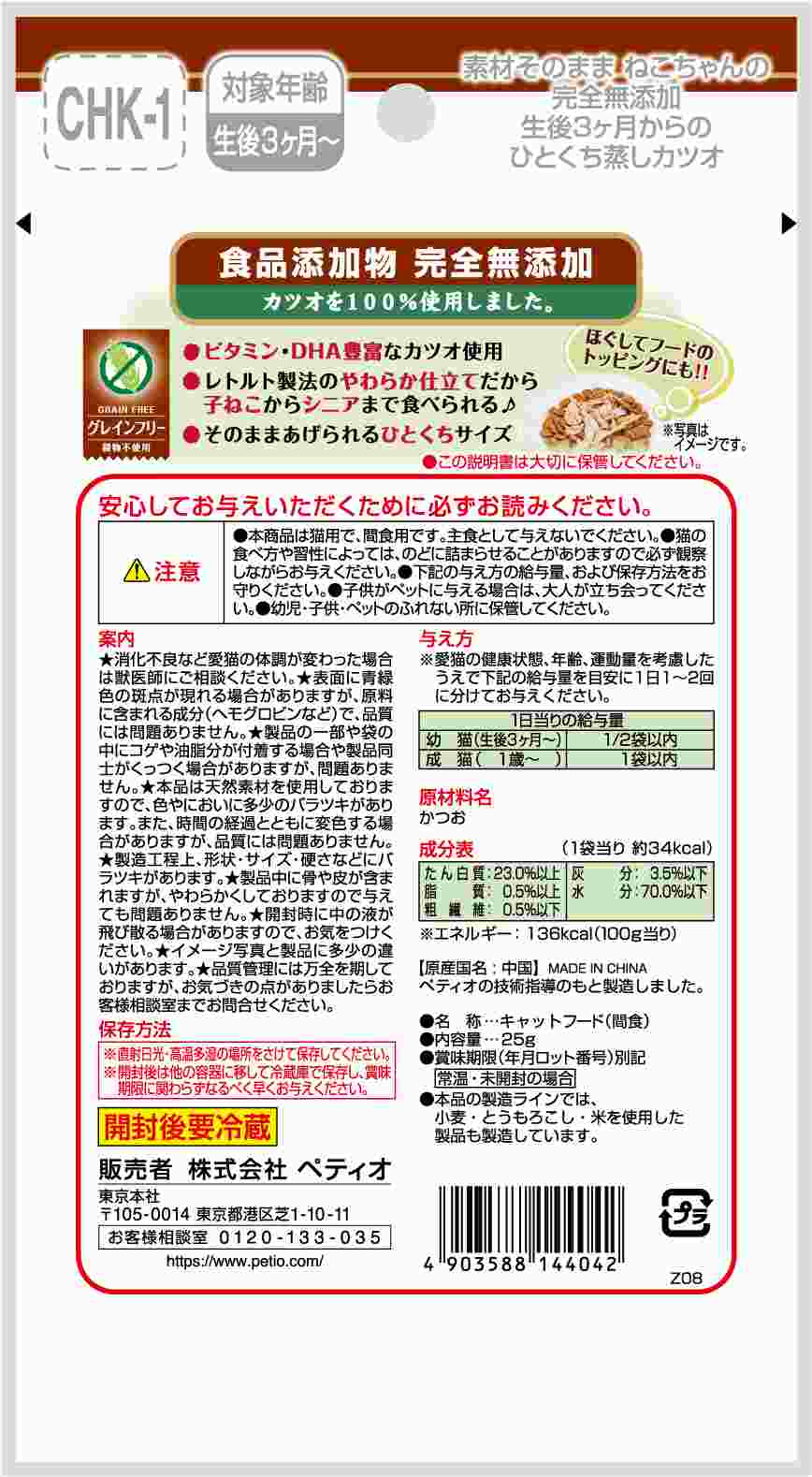 ペティオ 素材そのまま ねこちゃんの完全無添加 生後3ヶ月からのひとくち蒸しカツオ 25g