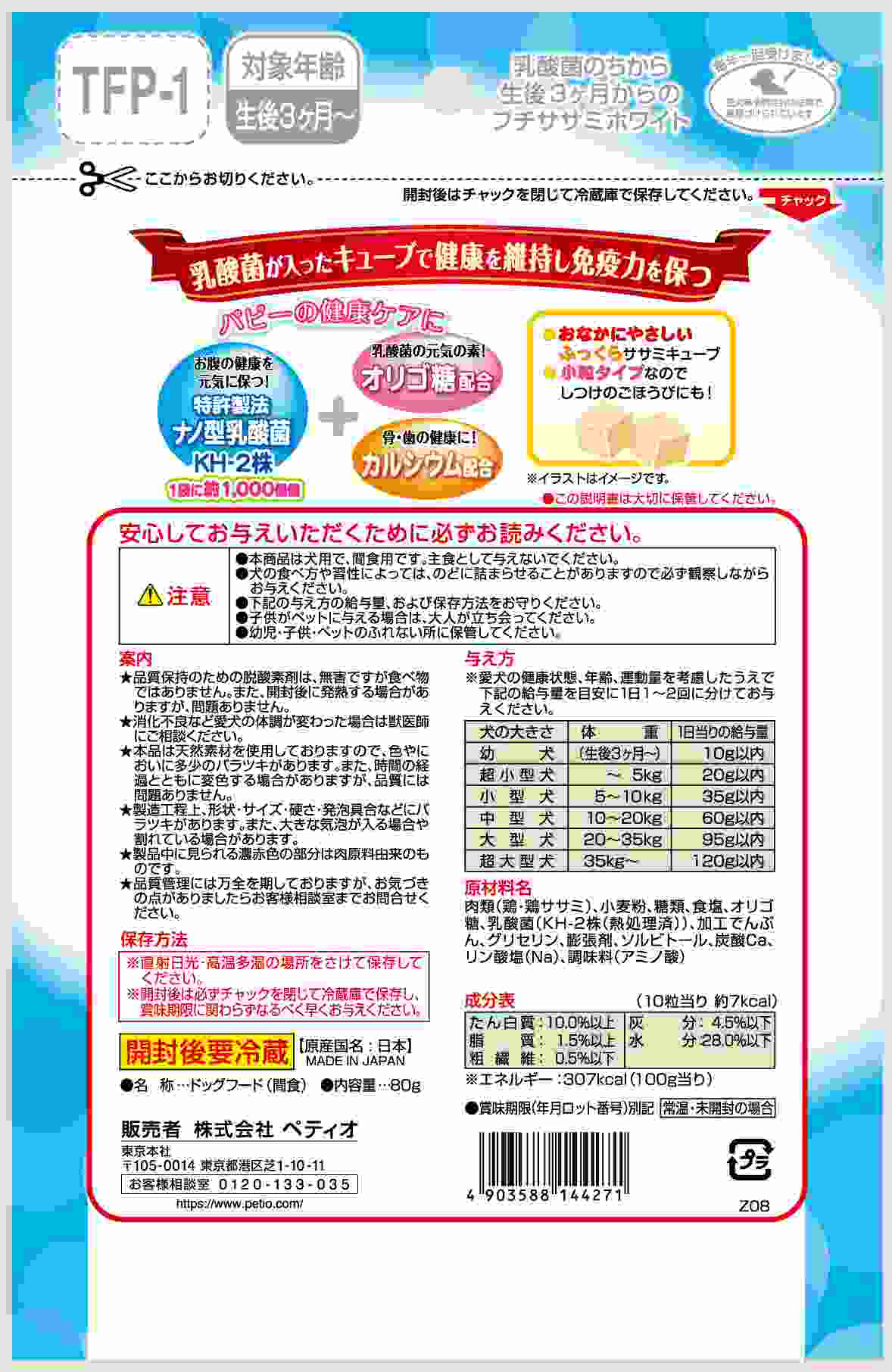 お腹の健康に配慮し1袋に1、000億個のナノ型乳酸菌KH-2株とオリゴ糖が入ったプチササミキューブ。さらにパピーの骨・歯の健康維持にカルシウム配合。お腹にやさしいふっくらササミでしつけのごほうびにもピッタリな小粒タイプ!10粒で約7kcal。着色料・発色剤 無添加。