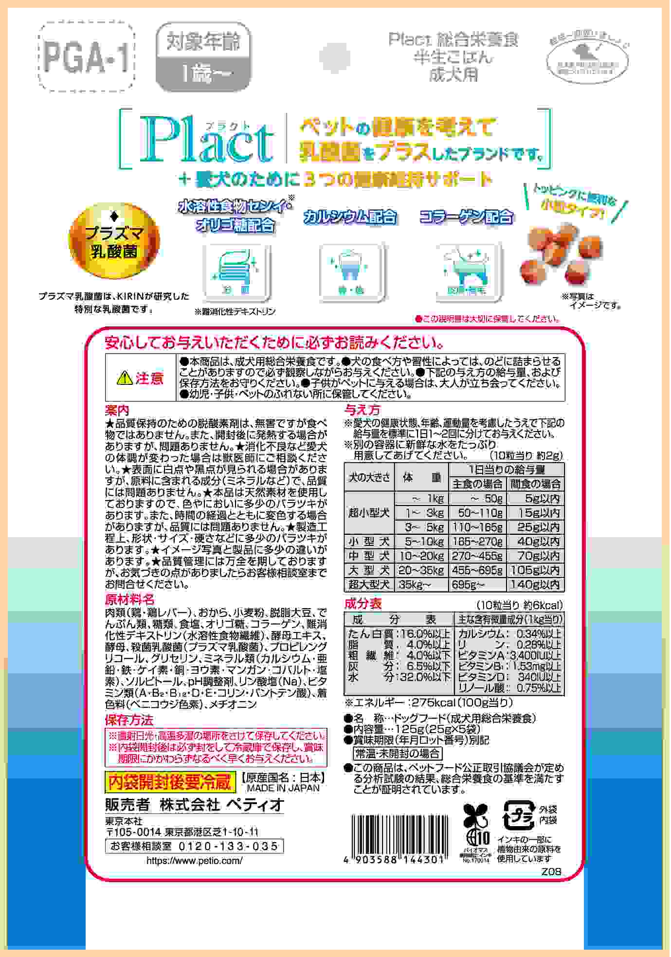 Plactはペットの健康を考えて乳酸菌をプラスしたブランドです。便利な分包タイプ!プラズマ乳酸菌による免疫ケアに加えて、愛犬のための3つの健康維持サポート!お腹、骨・歯、皮膚・被毛ケア。10粒当り約6kcalで小粒タイプなのでトッピングやしつけのご褒美にもオススメ!合成着色料・発色剤 無添加。