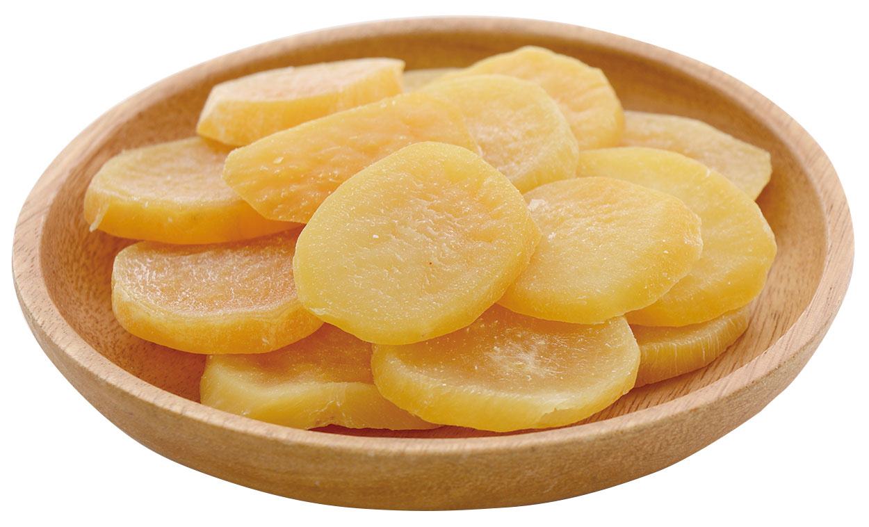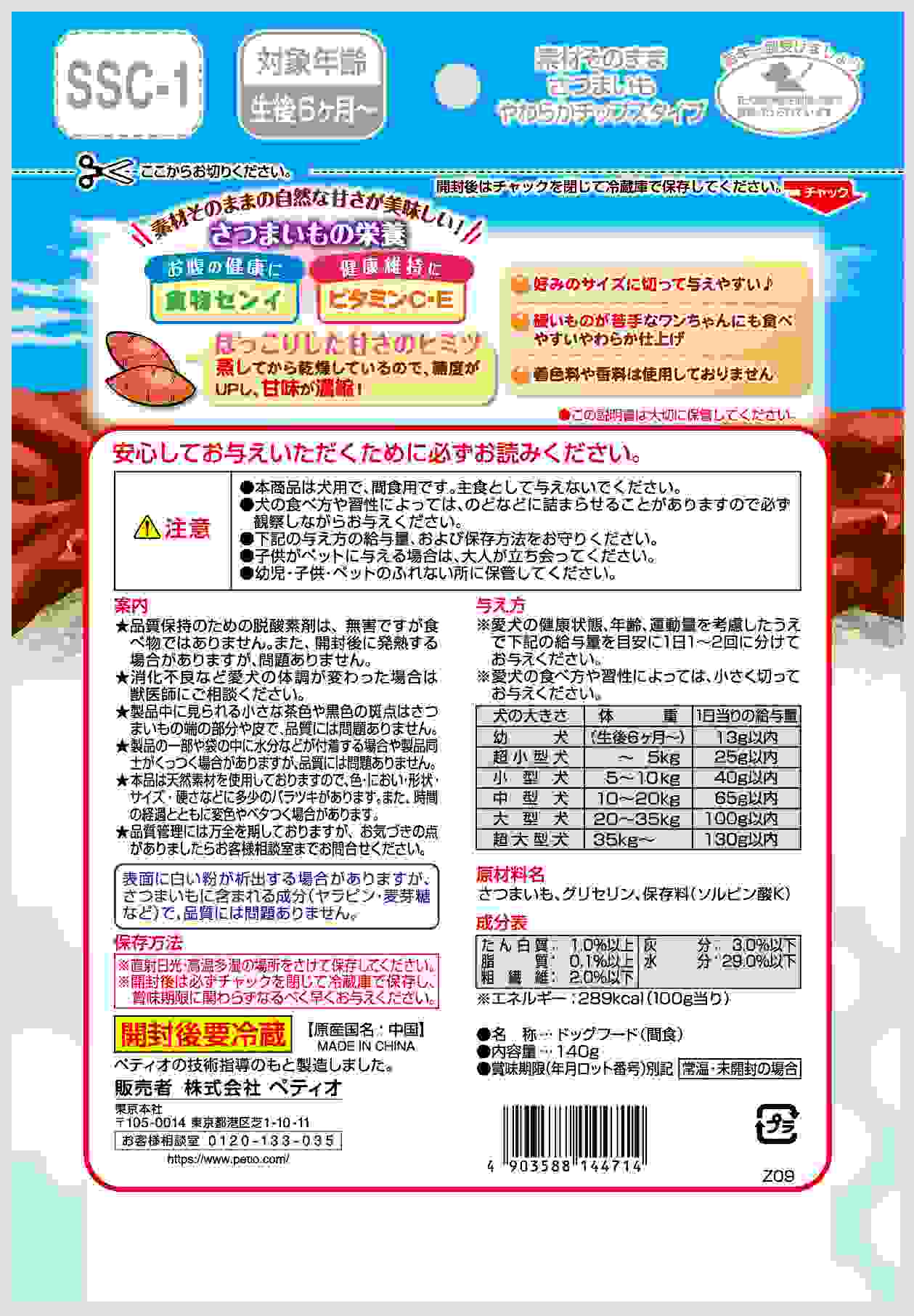豊富な食物センイとまろやかな甘味のさつまいもをまるごと使用。やわらかタイプで、お好みのサイズに切って与えやすいチップスタイプ。