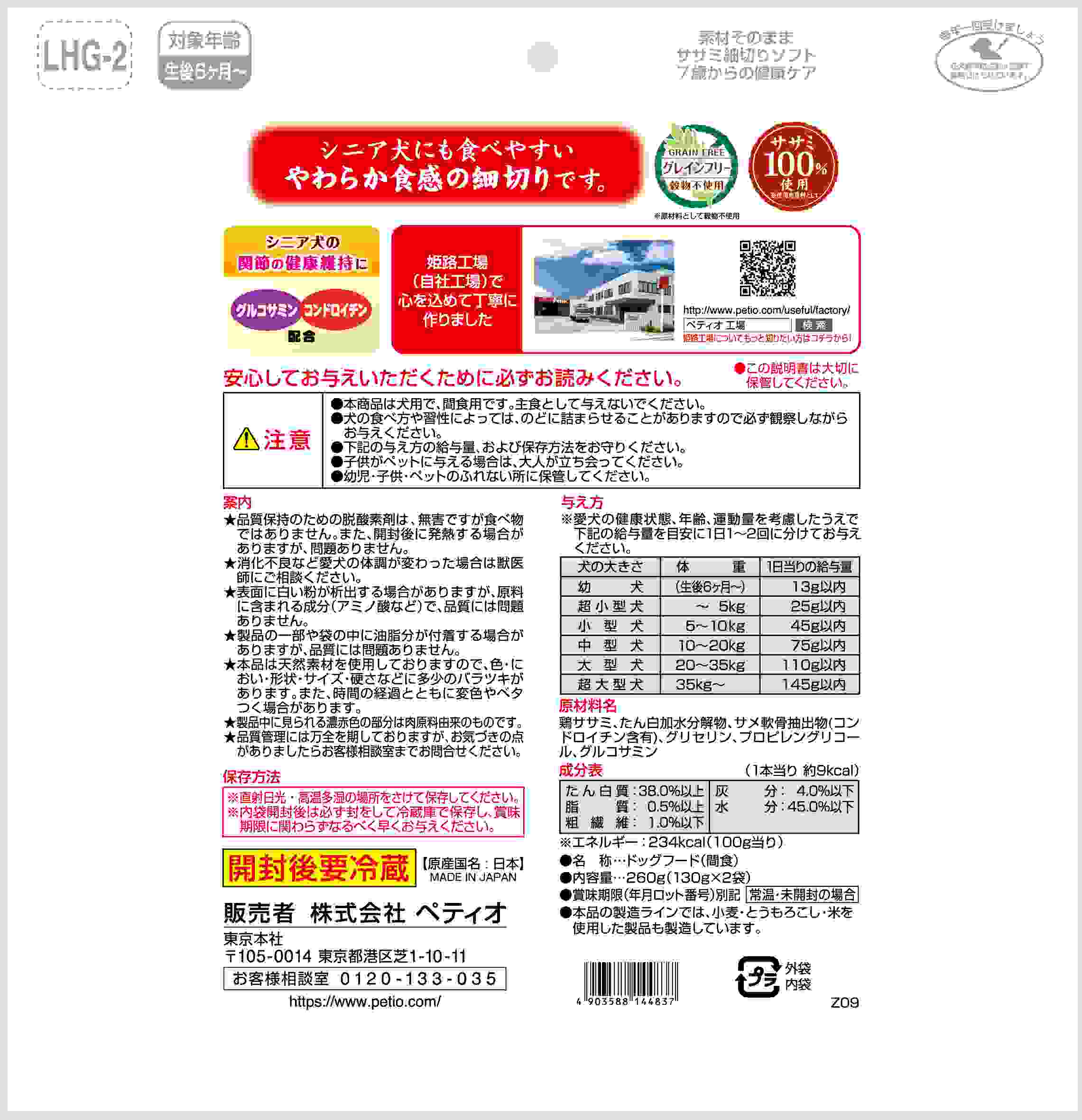 鶏ササミ、たん白加水分解物、サメ軟骨抽出物(コンドロイチン含有)、グリセリン、プロピレングリコール、グルコサミン