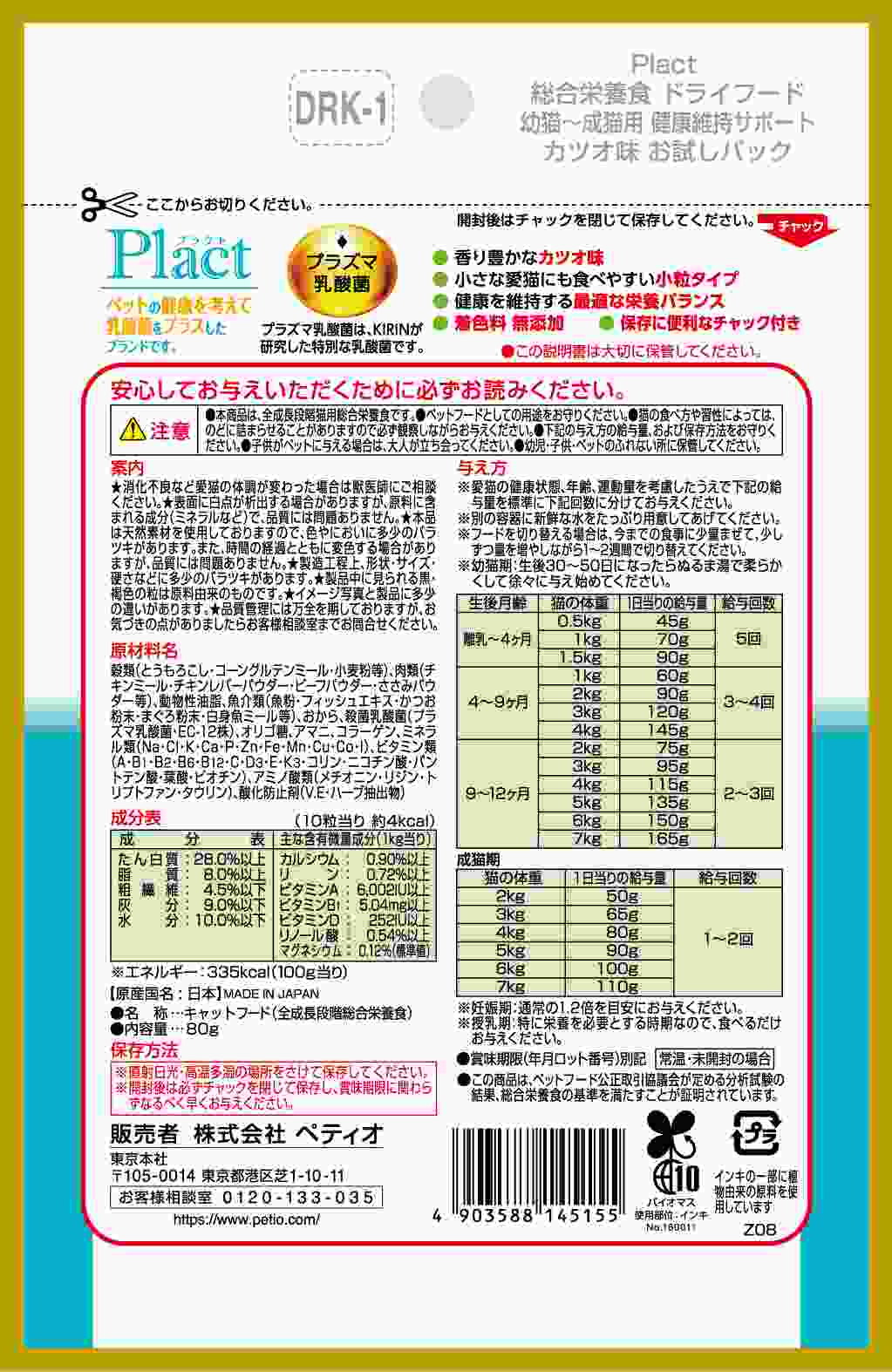 Plactはペットの健康を考えて乳酸菌をプラスしたブランドです。プラズマ乳酸菌による免疫ケアに加えて、愛猫の健康をトータルでサポート!下部尿路、お腹、皮膚・被毛ケア。タウリン配合。着色料 無添加。香り豊かなカツオ味。便利なチャック付きのお試しパック。