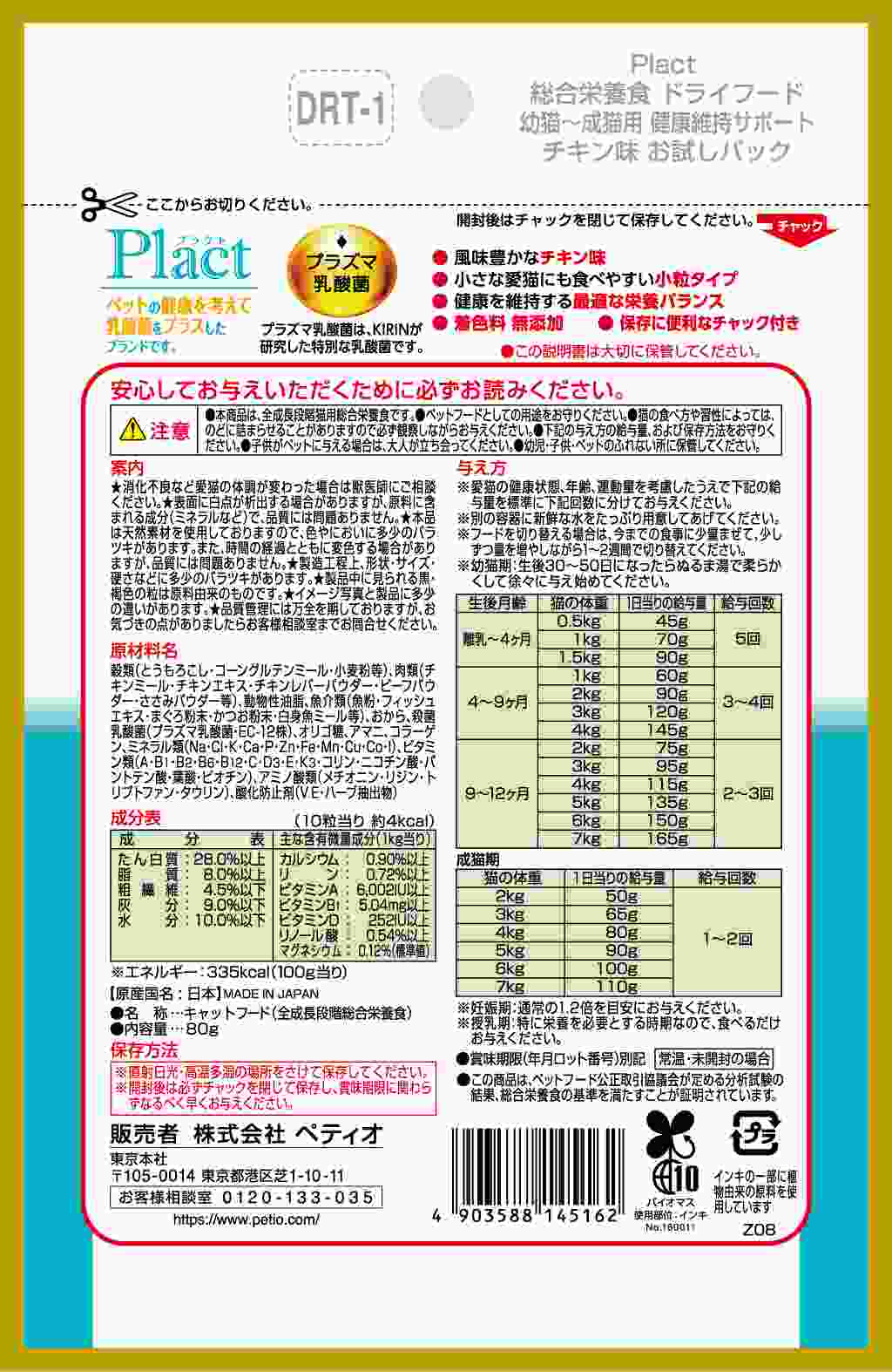 Plactはペットの健康を考えて乳酸菌をプラスしたブランドです。プラズマ乳酸菌による免疫ケアに加えて、愛猫の健康をトータルでサポート!下部尿路、お腹、皮膚・被毛ケア。タウリン配合。着色料 無添加。風味豊かなチキン味。便利なチャック付きのお試しパック。