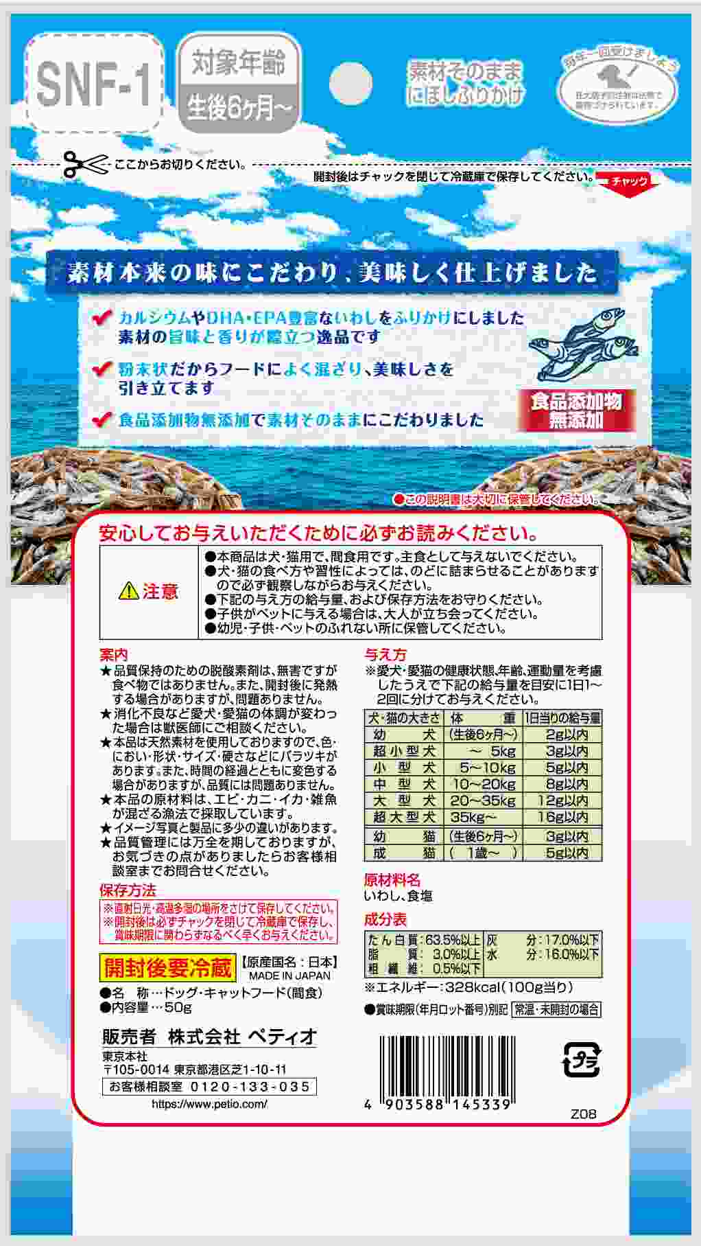食品添加物無添加で素材そのまま。粉末状だからフードに良く混ざり、美味しさを引き立てます。カルシウム・DHA・EPA豊富ないわしを使用。