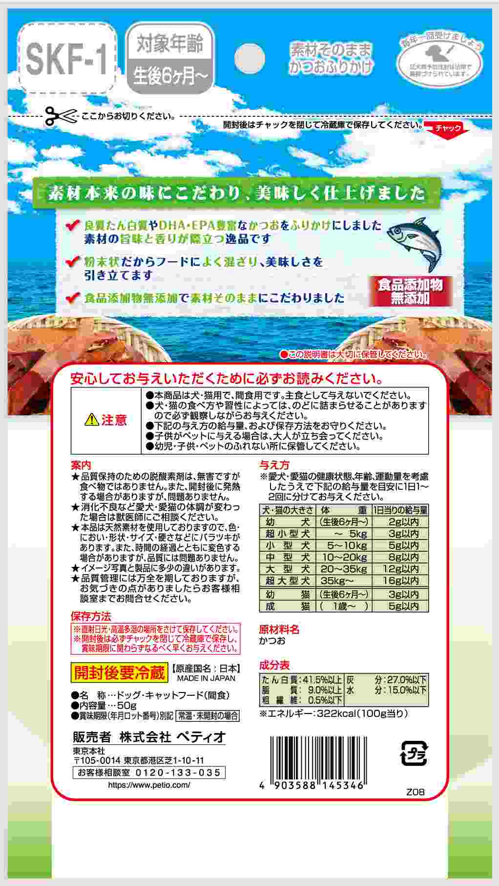 食品添加物無添加で素材そのまま。粉末状だからフードに良く混ざり、美味しさを引き立てます。良質たん白質・DHA・EPA豊富なかつおを使用。
