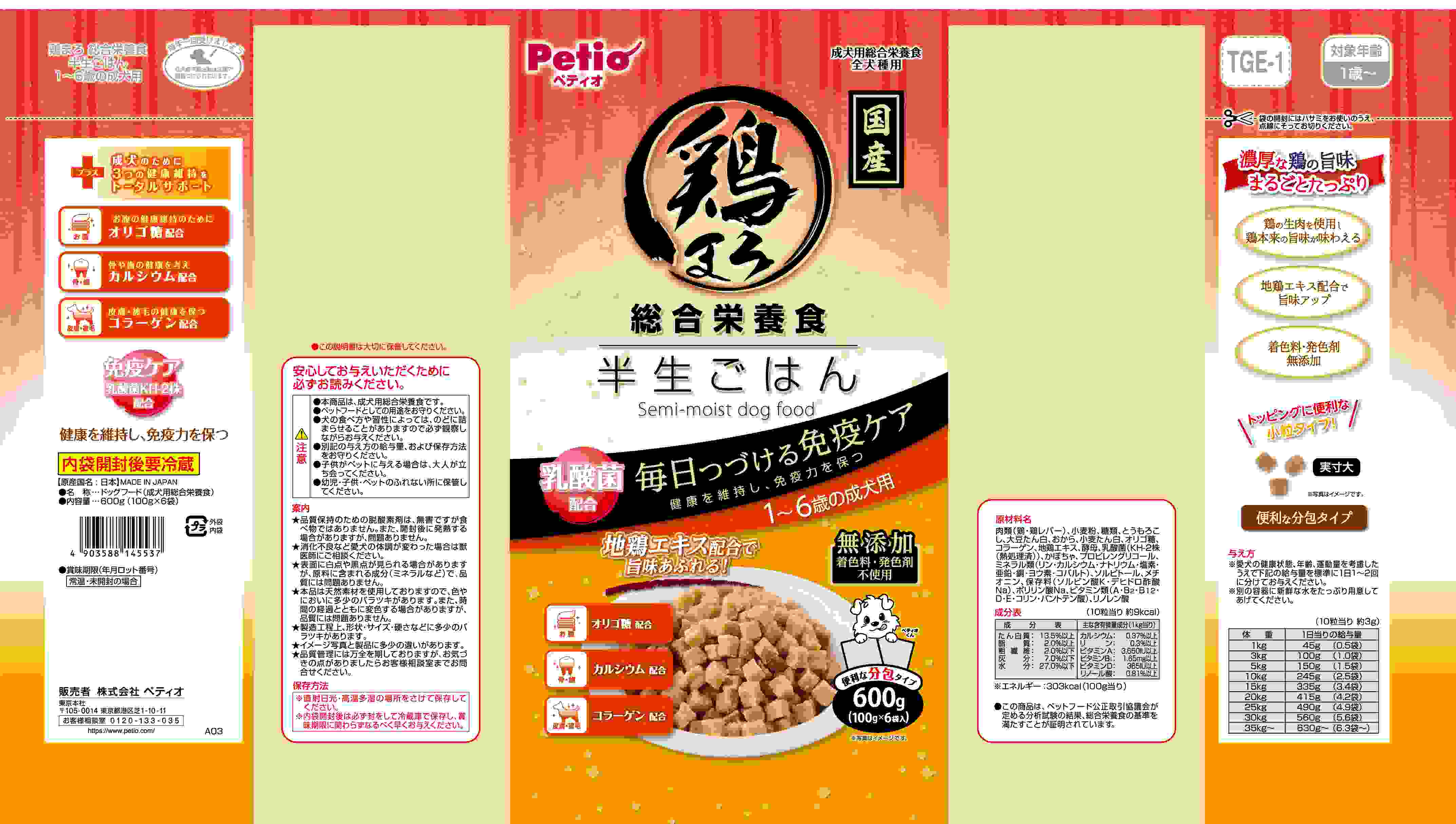 鶏の生肉を使用し、地鶏エキスを配合することで、濃厚な鶏の旨味まるごとたっぷり味わえる。乳酸菌KH-2株配合で免疫ケアに加えて、お腹、骨・歯、皮膚・被毛の健康維持をトータルでサポート。成犬用セミモイストフード。便利な分包タイプ。