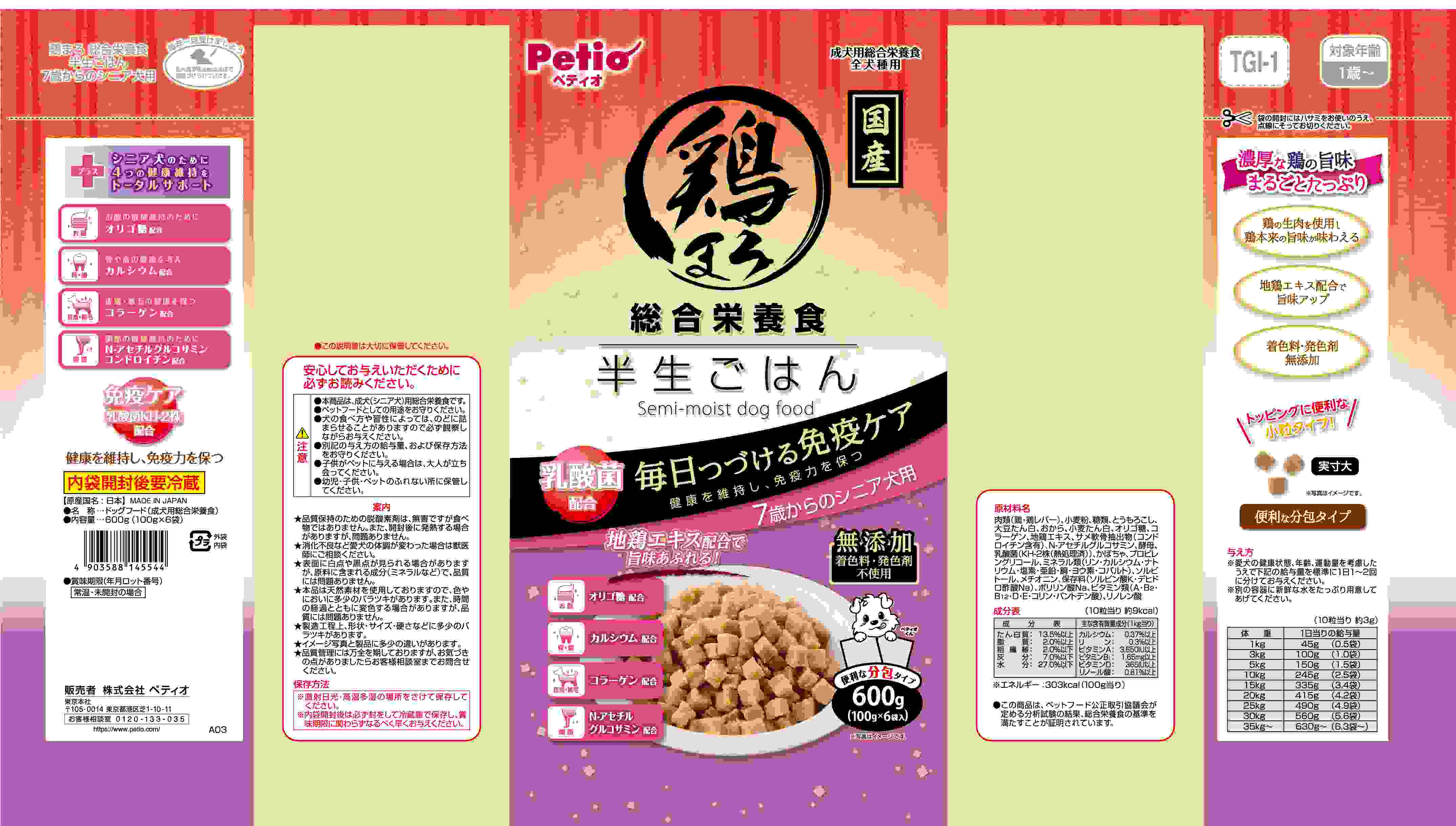 濃厚な鶏の旨味まるごとたっぷり。鶏の生肉を使用し鶏本来の旨味が味わえる。地鶏エキス配合で旨味アップ。着色料・発色剤無添加。乳酸菌KH-2株配合で毎日つづける免疫ケア。お腹、骨・歯、皮膚・被毛、関節の健康維持をトータルサポート。便利な小粒タイプ。7歳からのシニア犬用。便利な分包タイプ。