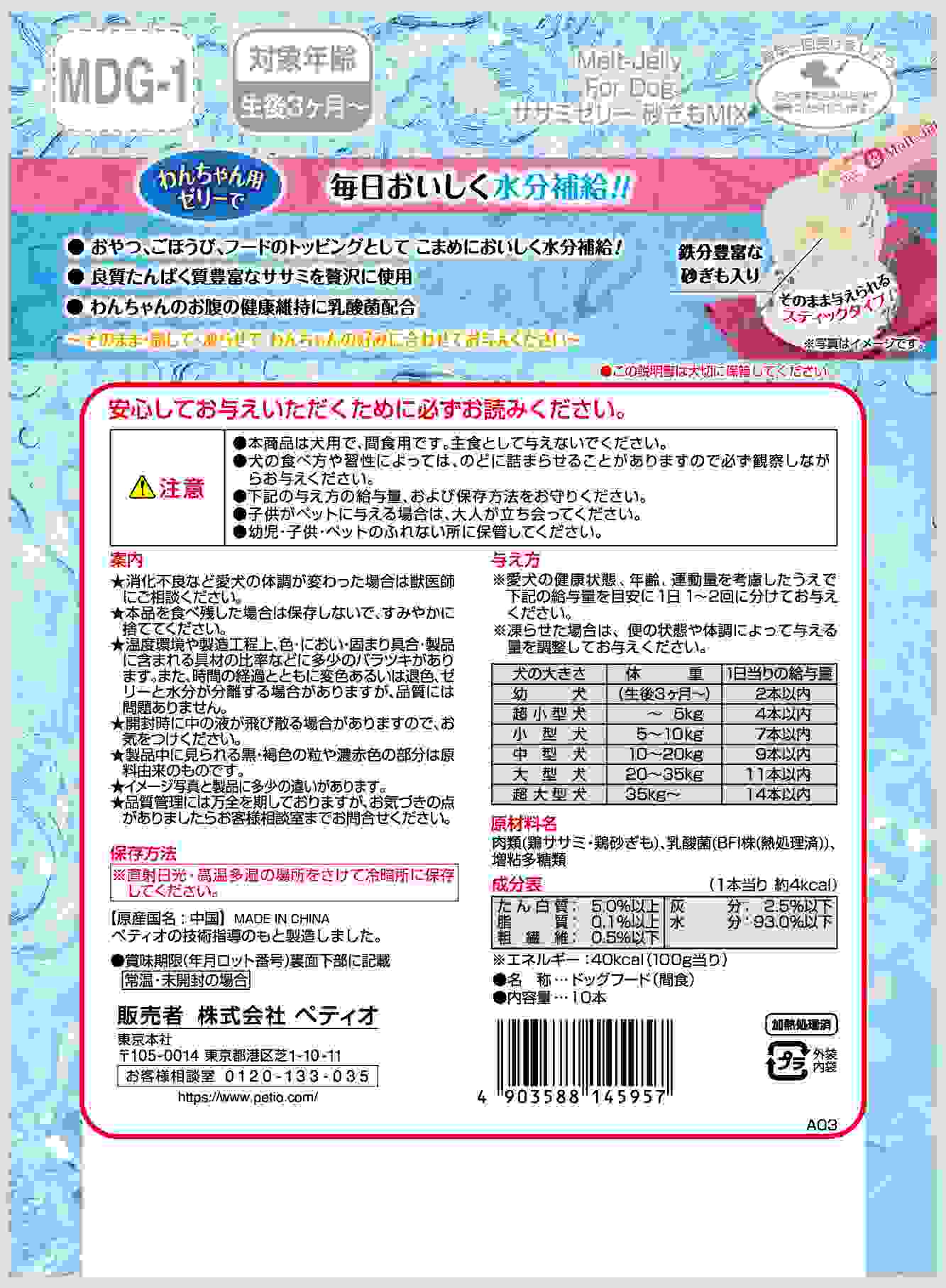ペティオ メルトジュレ ForDog 水分補給 ササミゼリー砂ぎもMIX乳酸菌入り 10本
