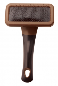 猫の細くてやわらかい被毛に合わせた極細ピン。長毛種に合わせた全長約15mmの二段ピンで毛の奥まで入り込み抜け毛をしっかりかき出す。猫のデリケートな肌をいたわるためにピンの先端には先丸コーティング、ラバークッション仕様で負荷を軽減し肌の当りがやさしい。