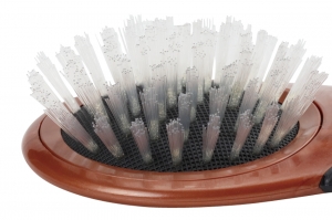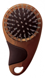 猫の細くてやわらかい被毛を無理なくとかすソフトなナイロンピン。段カット植毛で被毛の奥まで届きやすい。密に埋め込まれたブラシが被毛にまんべんなく入り込み、毛と地肌についた汚れや細かいフケをかき出し取り除く。