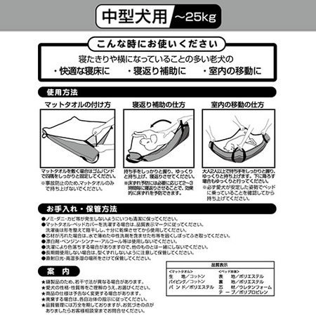 <マットタオル>生地:綿100%、パイピング:綿100%、バンド:ポリエステル<ベッド本体>表地:ポリエステル100%、裏地:ポリエステル100%、芯材:ウレタンフォーム、テープ:ポリプロピレン