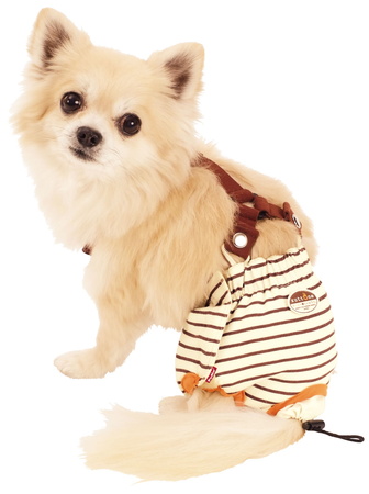 モレを防ぐサイズ調節機能付しっぽ穴。パンツが脱げるのを防ぐサスペンダー付。サイドの面ファスナーで着脱簡単。お手入れしやすいコットン素材使用。