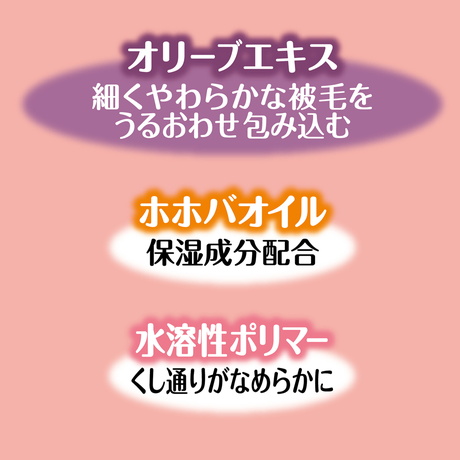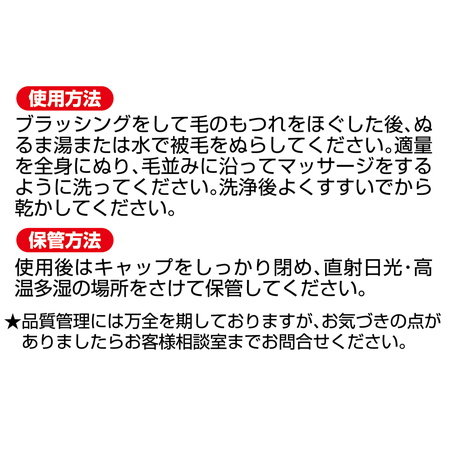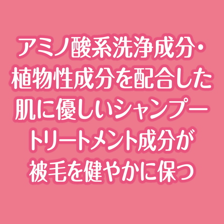 皮脂のベタつきや被毛の汚れを優しく洗います。保湿成分ホホバオイルとオリーブエキス配合。ほのかで優しいベビーシャボンの香り。