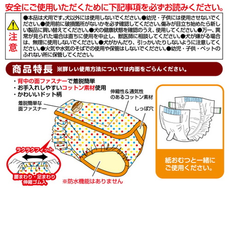 面ファスナーを留めるだけで着脱可能。お手入れしやすく伸縮性&通気性のあるコットン素材使用。腰まわり・足まわりに伸縮ゴムを使用。手洗い可能。※紙おむつと一緒に使用。※防水機能なし。