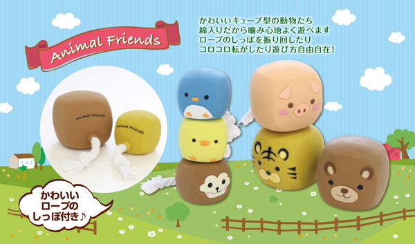 かわいいキューブ型の動物たち。綿入りで噛み心地よく遊べます。ロープのしっぽを振り回したり、コロコロ転がしたり遊び方自由自在!