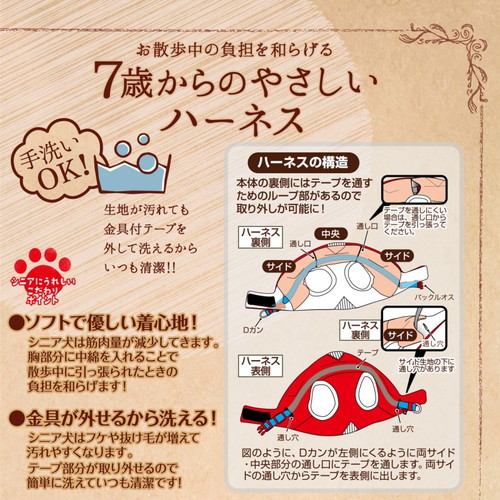 お散歩中の負担を和らげる7歳からのワンちゃんに最適なハーネス。胸部分に中綿を入れることで散歩中に引っ張られたときの負担を和らげます。また、生地が汚れても金具付テープを外して洗えるからいつも清潔!