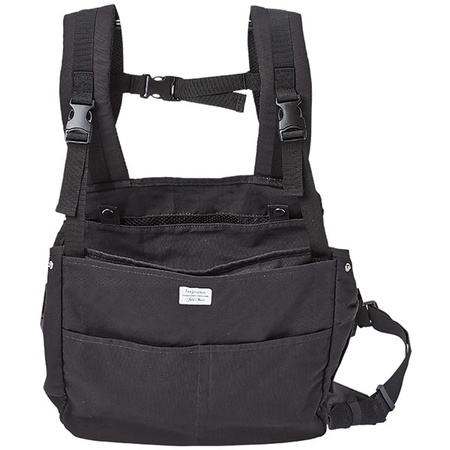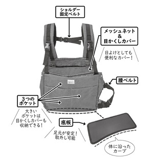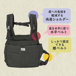 両肩ショルダー仕様で肩への負担がかかりにくく、腰ベルトでしっかり固定できる。