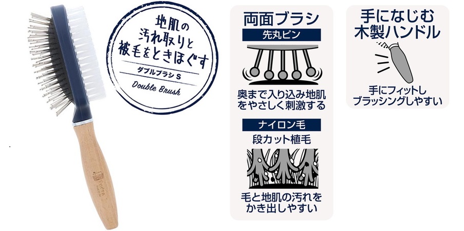 ◆両面ブラシ 〇先丸ピン:奥まで入り込み地肌をやさしく刺激する。 〇ナイロン毛(段カット植毛):毛と地肌の汚れをかき出しやすい。◆手になじむ木製ハンドル:手にフィットしブラッシングしやすい。