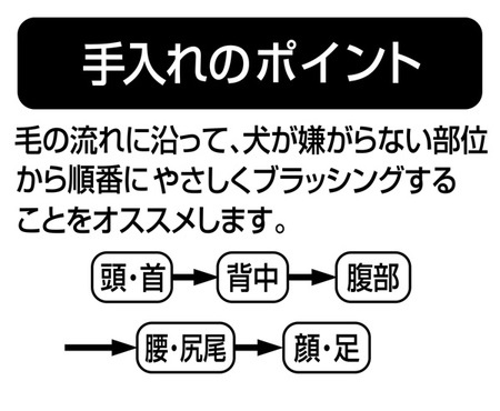 生活の中で、毛に汚れやホコリ等がつきます。ベタつきや乾燥をほっておくとフケやニオイも出やすくなるので、こまめに取り除きましょう。また、先丸ピンでやさしく毛をときほぐし、美しい毛並みを保ちましょう。