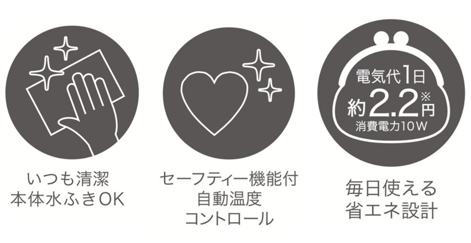 しっかりあったか高温面(約39℃)とやさしいあったか低温面(約32℃)でいつでも快適です。便利な固定ホールでサークルなどにも取付けできます。180度スイングプラグなので狭い場所でも配線しやすくなってます。 本体は水ふき可能でいつも清潔です。毎日使える省エネ設計です。コード長さ:約1.5m。
