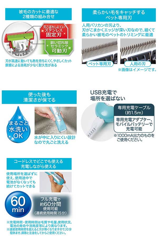 被毛をカットしてスッキリ・清潔・安心。狭い面のカットにピッタリなサイズ、足やおしりまわり、フェイスライン等をカット。カット幅27mm。汚れやすい顔や口まわりに・おしりまわりを清潔に保ちたい時に・シルエットを整えたい時に。まるごと水洗いOK。USB充電式。保証書付取扱説明書在中。