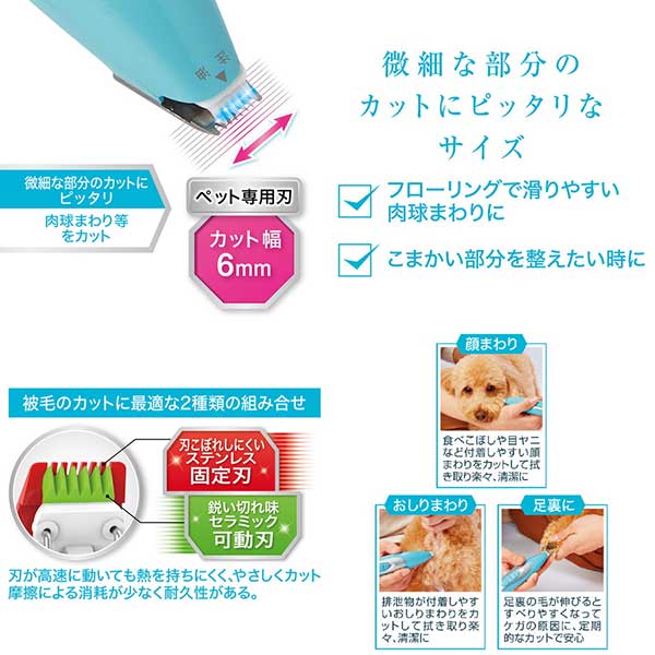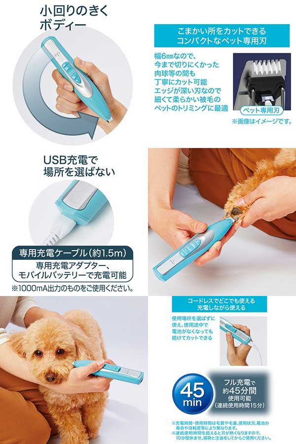 被毛をカットしてスッキリ・清潔・安心。微細な部分のカットにピッタリなサイズ、肉球まわり等をカット。カット幅6mm。フローリングで滑りやすい肉球まわりに・こまかい部分を整えたい時に。USB充電式。保証書付取扱説明書在中。