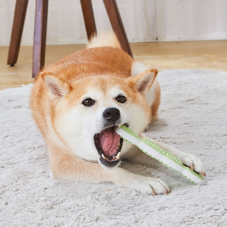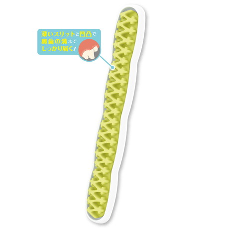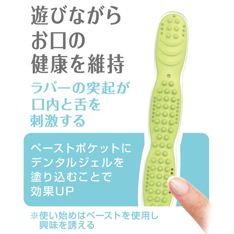 2つの噛みごこちで遊びながらお口の健康を維持。ラバーの突起が口内と舌を刺激する。ペーストポケットにデンタルジェルを塗り込むことで効果UP。中型犬やマズルの長いワンちゃんも奥歯までしっかり噛める長さ。