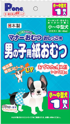 男の子のマーキング、おもらし、介護、おでかけに、使い捨てタイプのマナーベルトです!!吸収面積が広がり吸収力UP!! 新波型ストライプの表面材を採用し、吸収スピードUP!! 逆戻り極少!!吸収面積が広がり吸収力UP。男の子のマーキング、おもらし、介護、おでかけの用途で使用できる使い捨てマナーベルトです。<原材料> 表面材:ポリエチレン、ポリエステル系不織布。吸収材:綿状パルプ、吸収紙、高分子吸水材。帽子材:ポリエチレンフィルム。止着材:面ファスナー。伸縮材:ポリウレタン。結合剤:ホットメルト。 <内容数>超小型犬 2枚、小型犬 2枚、小中型犬 1枚、中型犬 1枚、中大型犬 1枚、大型犬 1枚≪使用方法≫ 内側のおしっこストップポケット(立体ギャザー)を起こします。※当製品に前後はありませんので、どちらからでもお使い頂けます。愛犬の局部をやさしく包み込むように、おなか側から巻き上げます。吸収体の中心に局部がくるように当ててあげると、上手に装着できます。※必ず局部がポケットの内側に収まっていることを確認してください。体にやさしくフィットするようにワンタッチテープを背中側でとめます。テープ位置は、愛犬にあわせて調節してください。 ≪使用上の注意≫ 用途以外には使用しないでください。紙おむつをハサミ等で切らないでください。汚れやモレの原因になります。使い捨てのペット用紙おむつですので、洗濯しないでください。汚れた紙おむつは、早めに取り替えてください。愛犬が、紙おむつをかんだり、ひっかいたりして、破らないようご注意ください。紙おむつは食べられませんのでご注意ください。万が一食べてしまった場合は、早急に獣医師にご相談ください。愛犬が、空き袋を破ったり、おもちゃにして遊ばないようにしてください。高温多湿を避け、直射日光の当たらない場所に保管してください。お子様や愛犬の手の届かないところに保管してください。 ※汚れた部分を内側にして小さく丸め、不衛生にならないように処理してください。※紙おむつはトイレに捨てないでください。※外出時に使った紙おむつは必ず持ち帰り、ご家庭で処理してください。※処理の方法はお住いの地域のルールに従ってください。