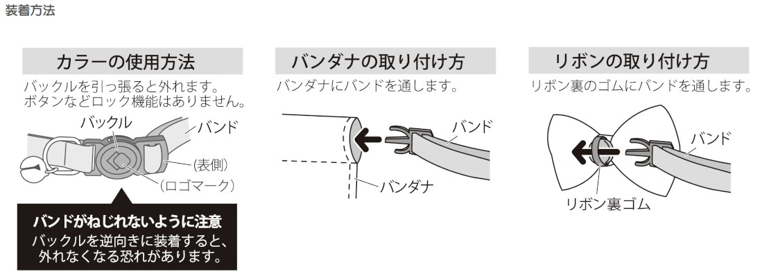 ご使用上の注意点・猫の屋内用首輪です。用途以外にはご使用にならないでください。・破損の原因となりますので噛ませないようにご注意ください。・濡れたままの状態で長時間ご使用になると色移りすることがあります。・飼い主の目の届く範囲でご使用ください。・ご使用の頻度に関わらずご購入後半年を目処にお取替えをおすすめします。