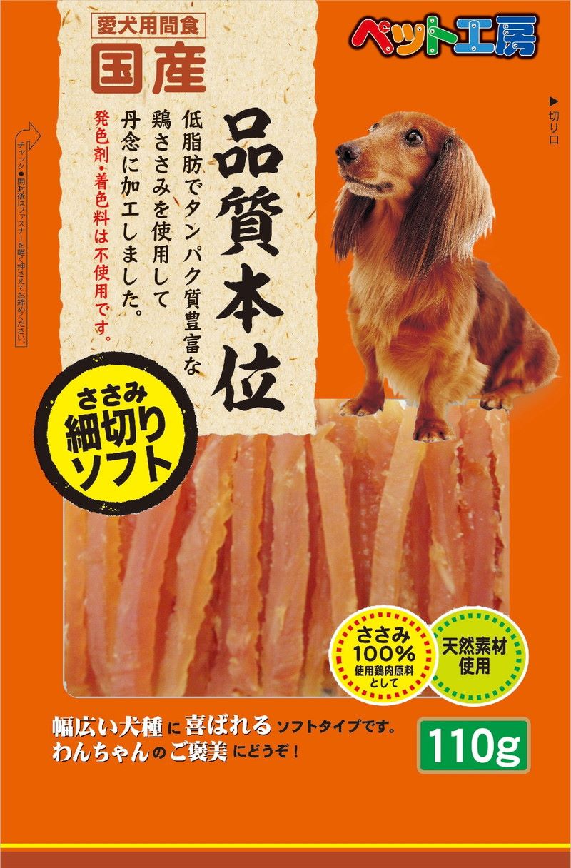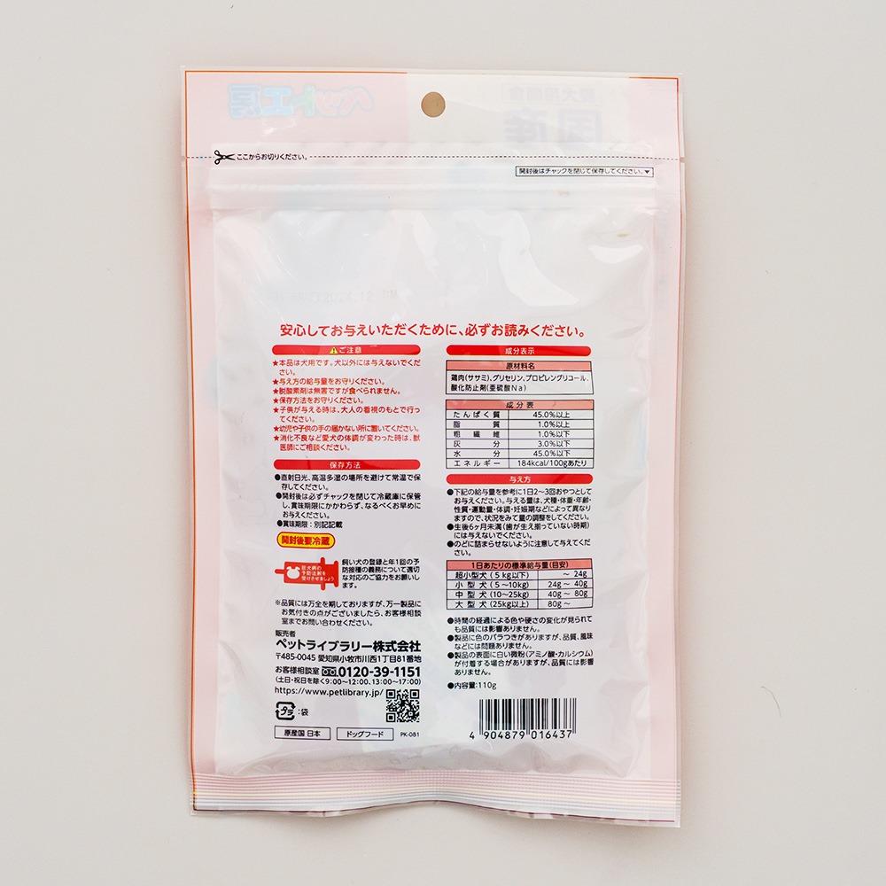 1本づくりのササミを細長くカットしました。 やわらかいタイプですので、シニア犬にも最適です。 低脂肪でタンパク質豊富な鶏ささみを使用して、丹念に加工しました。 発色剤・着色料不使用。 幅広い犬種に喜ばれるソフトタイプです。 わんちゃんのご褒美にどうぞ! 【与え方】 ・裏面の給与量を参考に1日2~3回おやつとしてお与えください。 ・与える量は犬種・体重・年齢・性質・運動量・体調・妊娠期などによって異なりますので、状況を見て量の調整をしてください。 ・生後6ヶ月未満(歯が生え揃っていない時期)には与えないでください。 ・のどに詰まらせないように注意して与えてください。 ・時間経過による色や硬さの変化が見られても品質には問題ありません。 ・製品の表面に白い微粉(アミノ酸・カルシウム)が付着する場合がありますが、品質には影響ありません。 【保存方法】 ・直射日光・高温多湿の場所を避けて常温で保存してください。 ・開封後は必ず冷蔵庫で保管し、賞味期限にかかわらず、なるべくお早めにお与えください。 【注意】 ・本品は犬用です。犬以外には与えないでください。 ・保存方法と与え方をお守りください。 ・子供が与える時は、大人の看視のもとで行ってください。 ・幼児や子供の手の届かない所に置いてください。 ・消化不良など愛犬の体調が変わった時は、獣医師にご相談ください。 ・脱酸素材は無害ですが、食品ではありません。