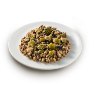 チキンをメインに野菜や果物が入ったメニューです。 鶏むね肉やたんぱく質・鉄分・亜鉛・ビタミンAを含む鶏レバーを使用し、βカロテン・ビタミンAを含むブロッコリーやニンジン、アントシアニンを含むブルーベリーなどを使用したこだわりごはんに仕上げました。 【アレルギー】鶏肉、りんご